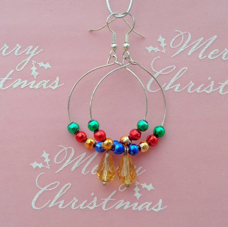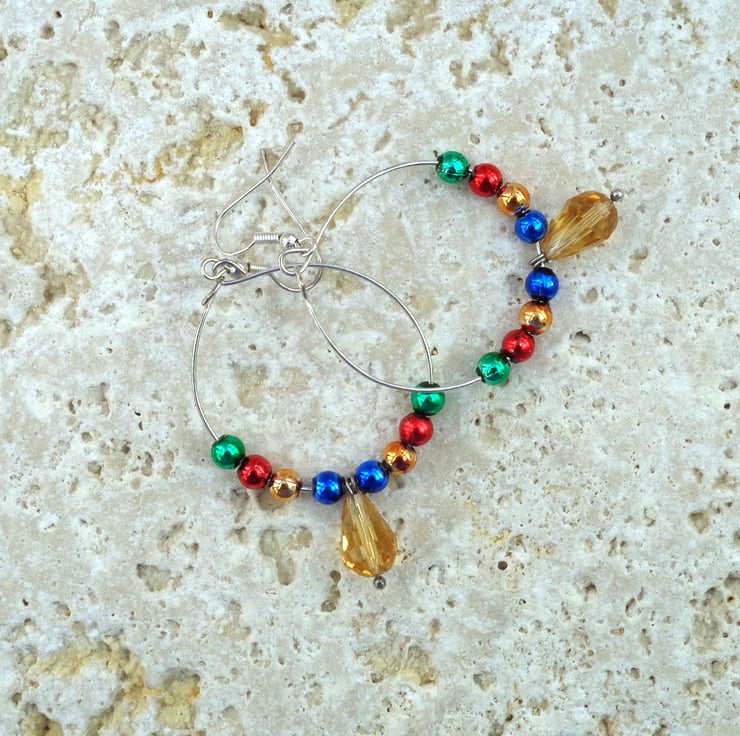 Simple hoops with multi-coloured beads with a central tear-drop shaped bead. Ideal for Christmas parties.