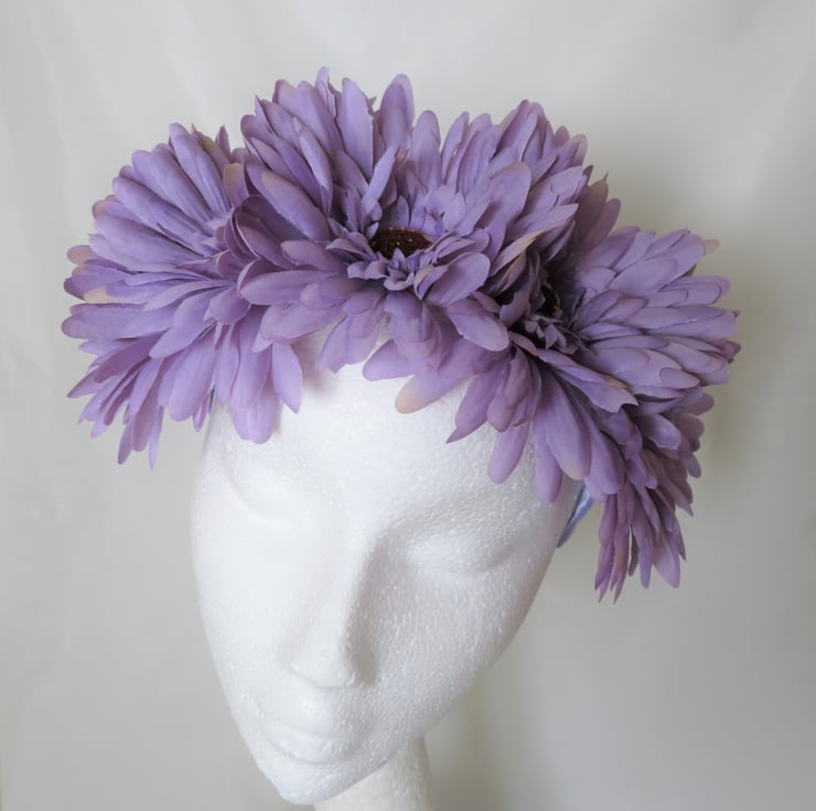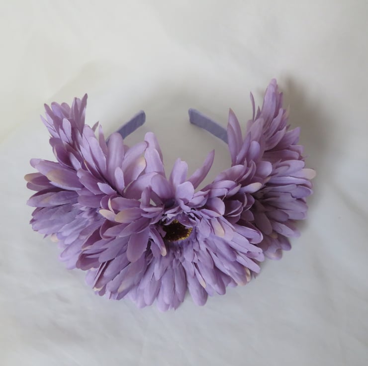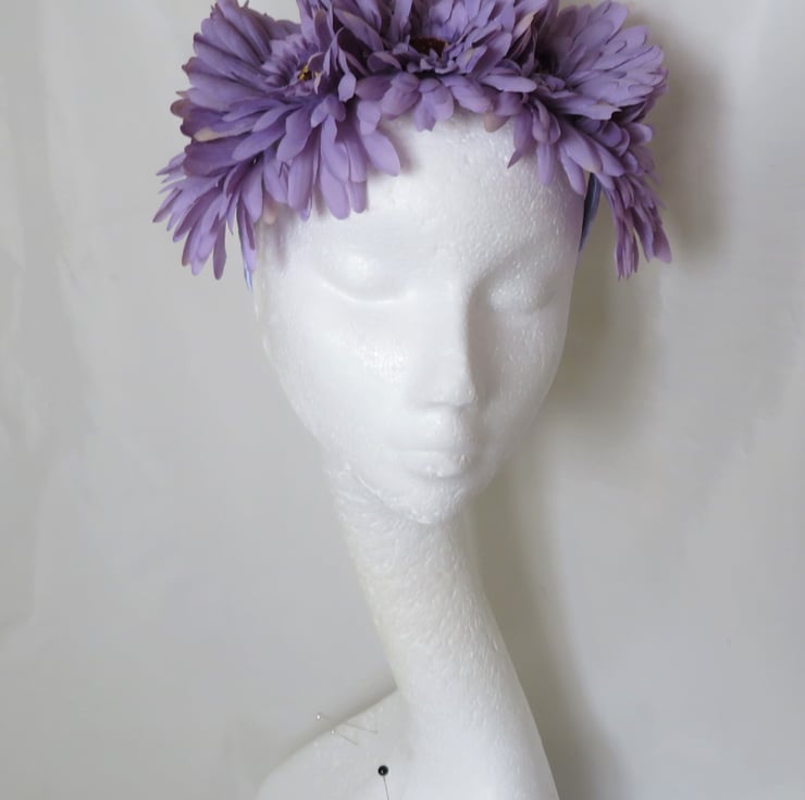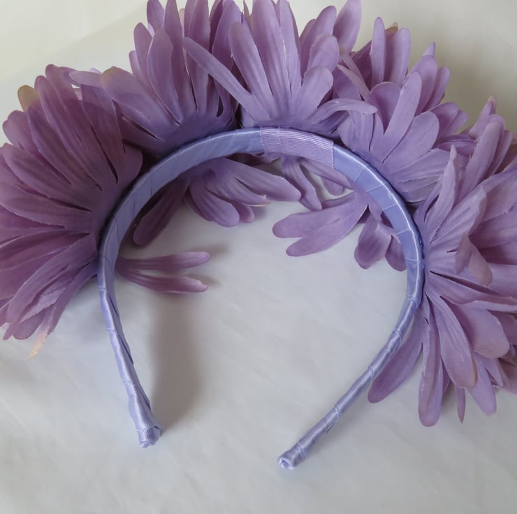 Made with a wide plastic headband hand wrapped with lilac satin ribbon.