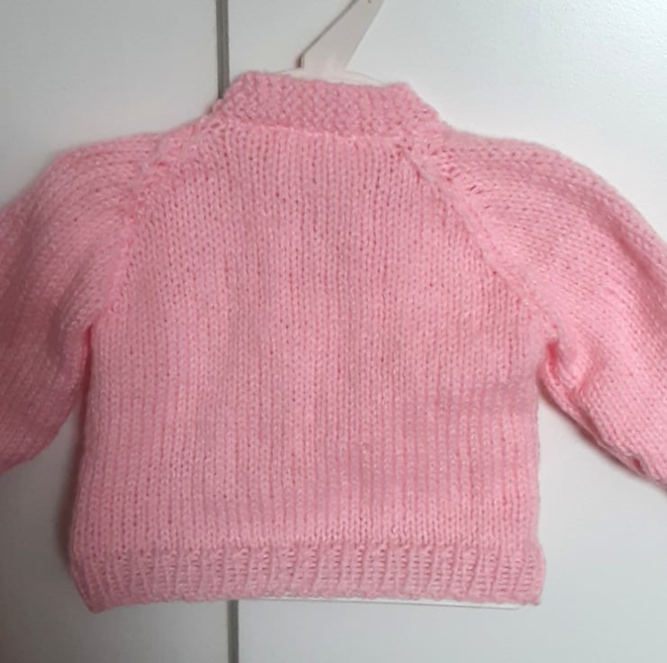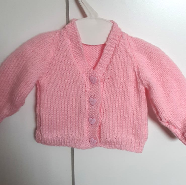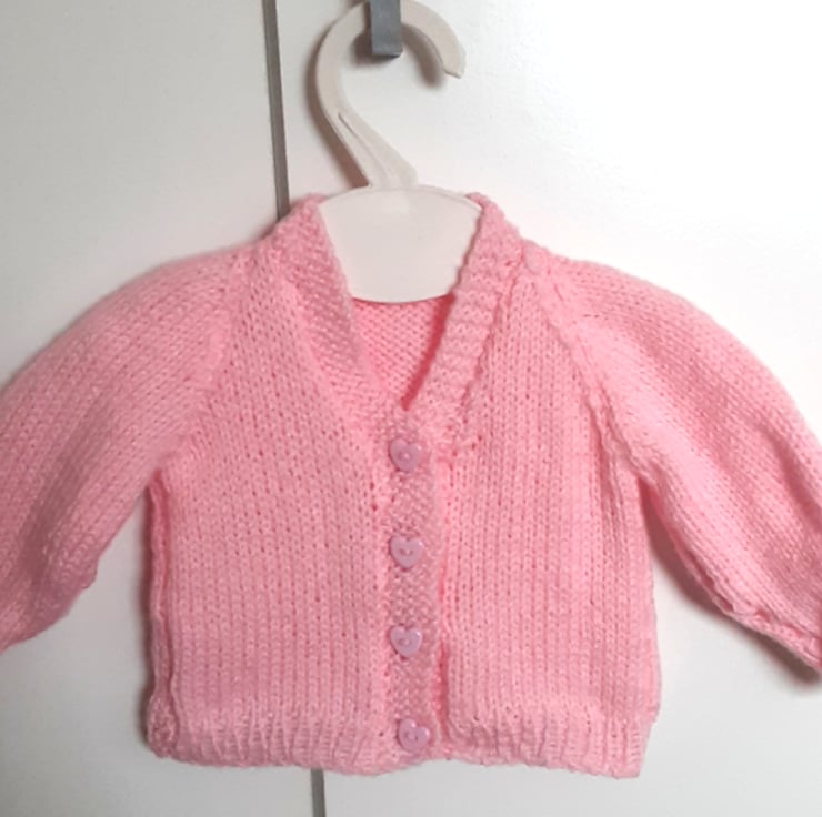 Hand knitted baby girl pink V necked long sleeve cardigan with 4 heart design button fastening