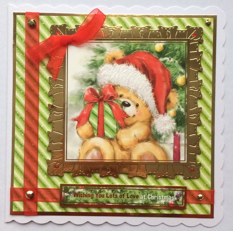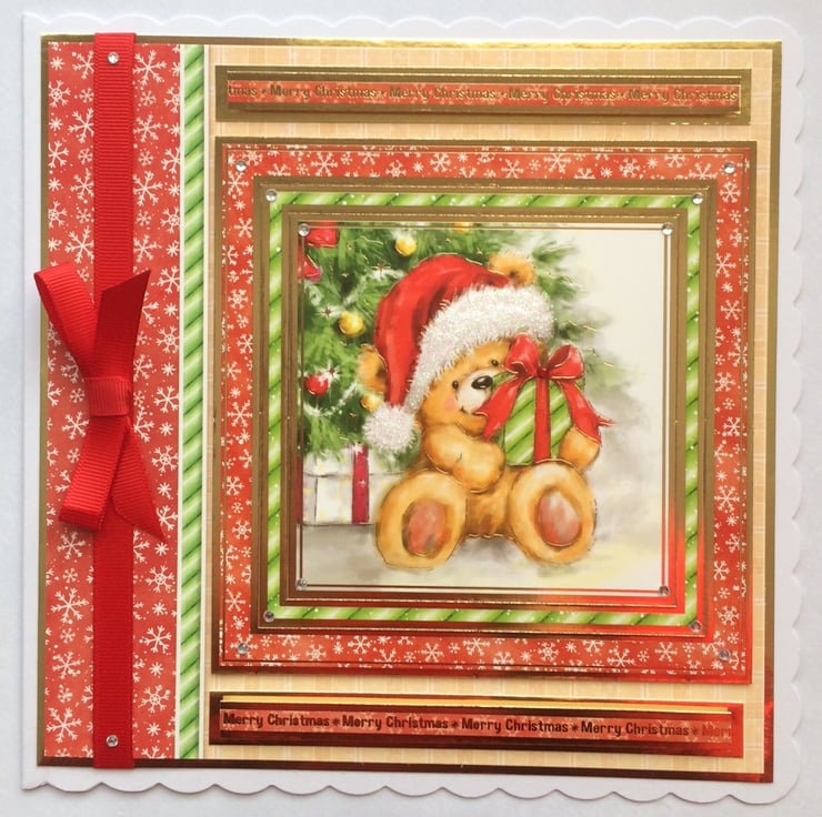 The design is a very cute teddy bear wearing a Santa hat and sitting under a Christmas tree with presents. The designs are hand cut and hand glittered by me.