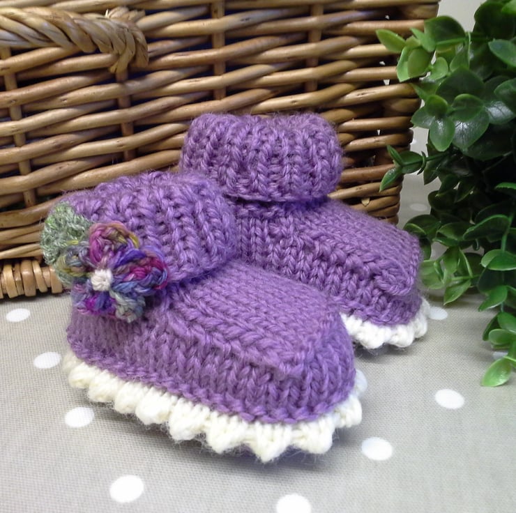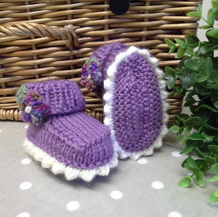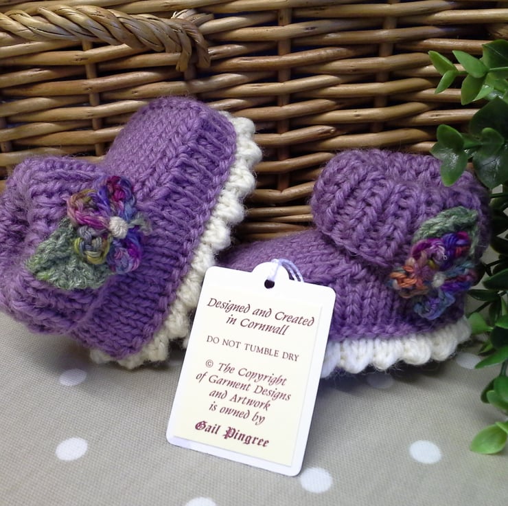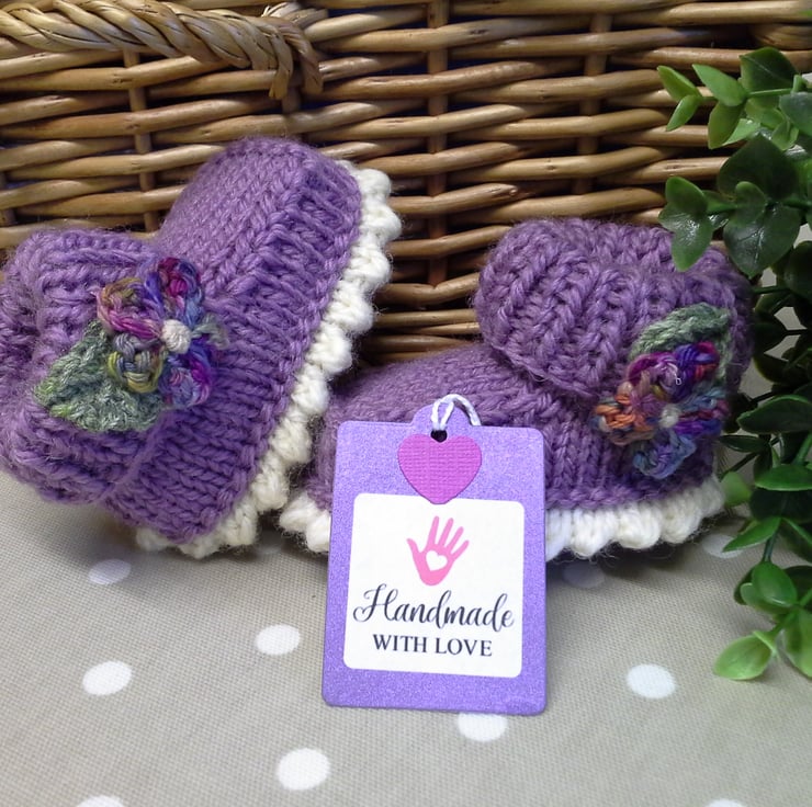 An adorable pair of baby girl's booties lovingly designed and totally hand crafted using the famous machine washable branded 'Jeager' Marino wool aran range yarns. The flowers have been hand crocheted using a hand dyed Marino wool blend yarn by a talented wool yarn designer. The leaves have also been hand crocheted using a fine 4 ply 'Jeager' yarn.