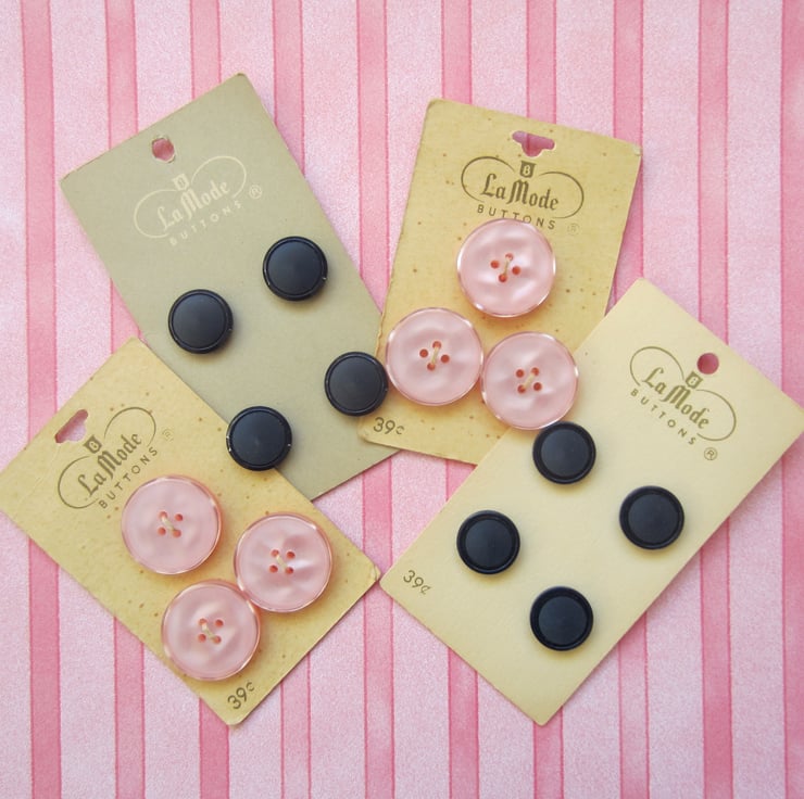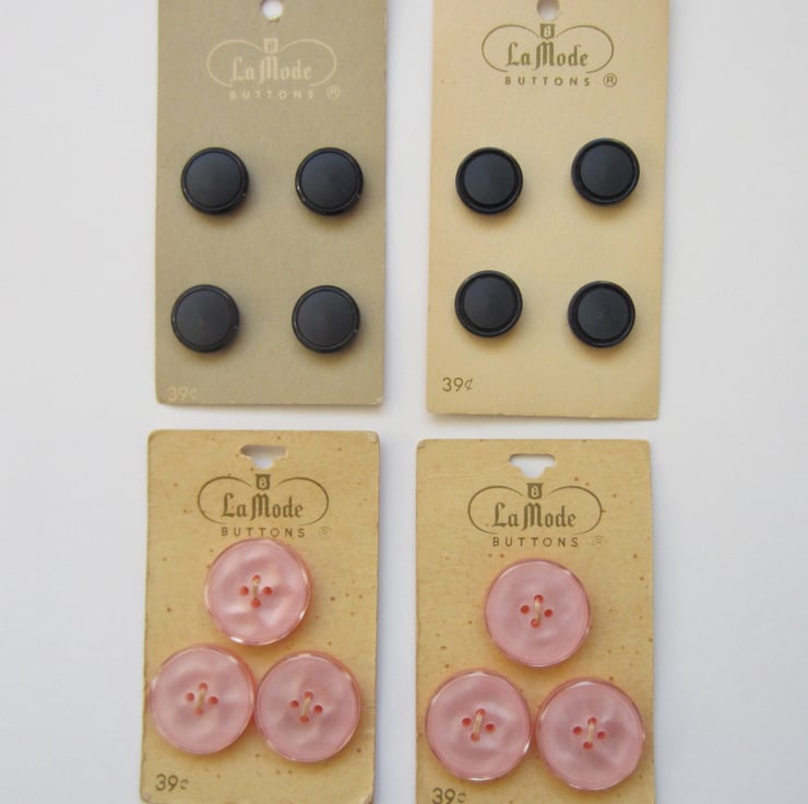 4 vintage cards of La Mode buttons. There are 2 cards of pink buttons all the same design. They measure 23 mm (7/8 inches) in diameter. And 2 cards of dark navy blue buttons in 2 slightly different designs. They measure 15 mm (just over 1/2 inch) in diameter.