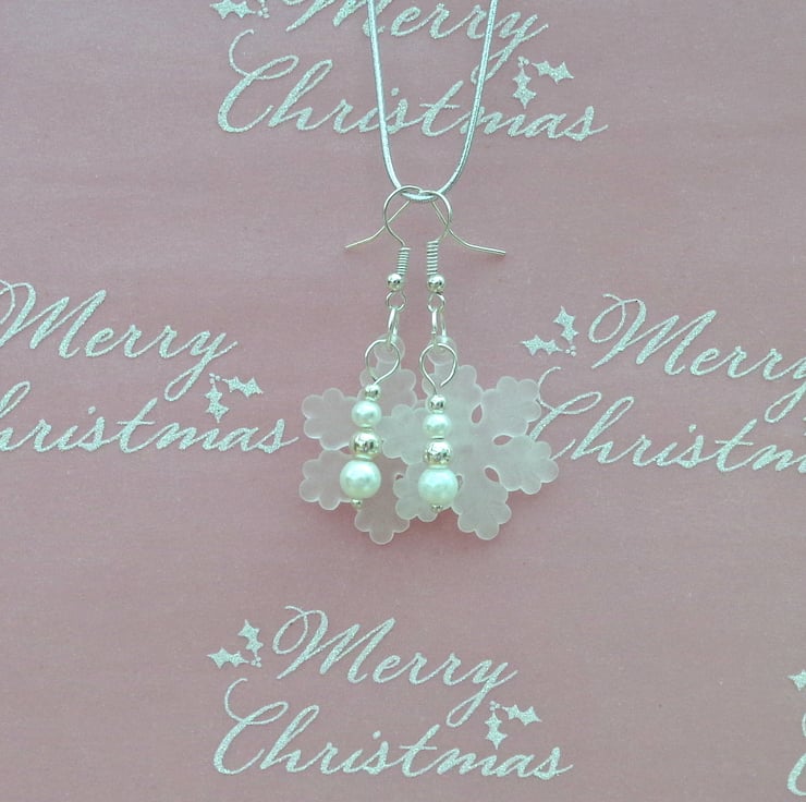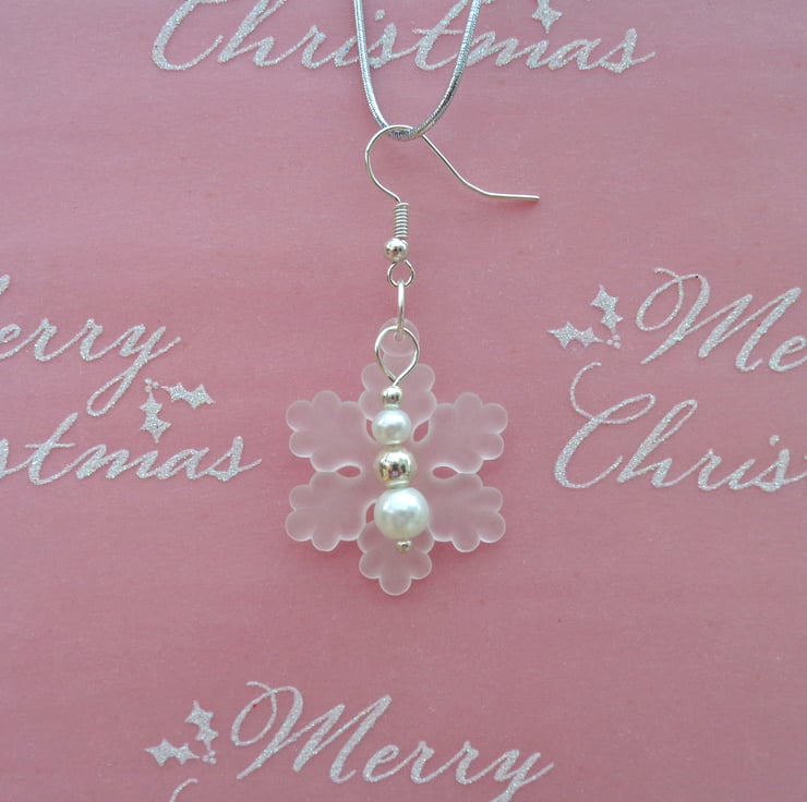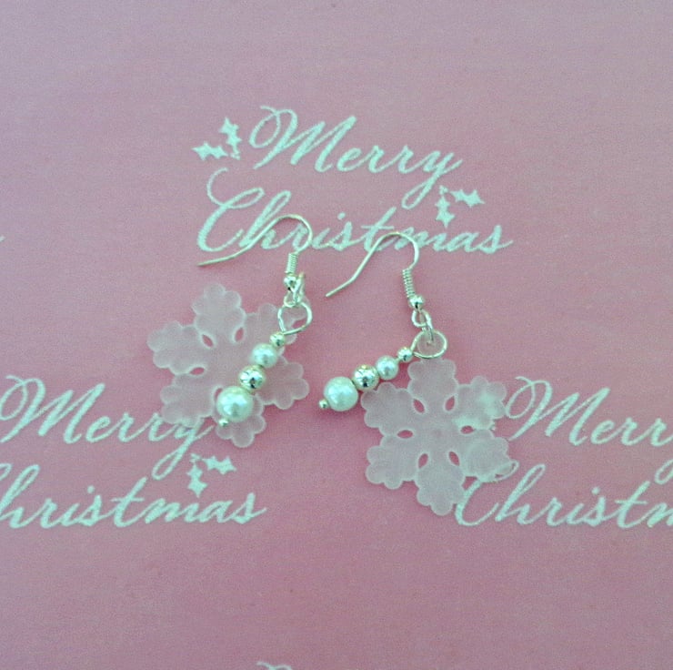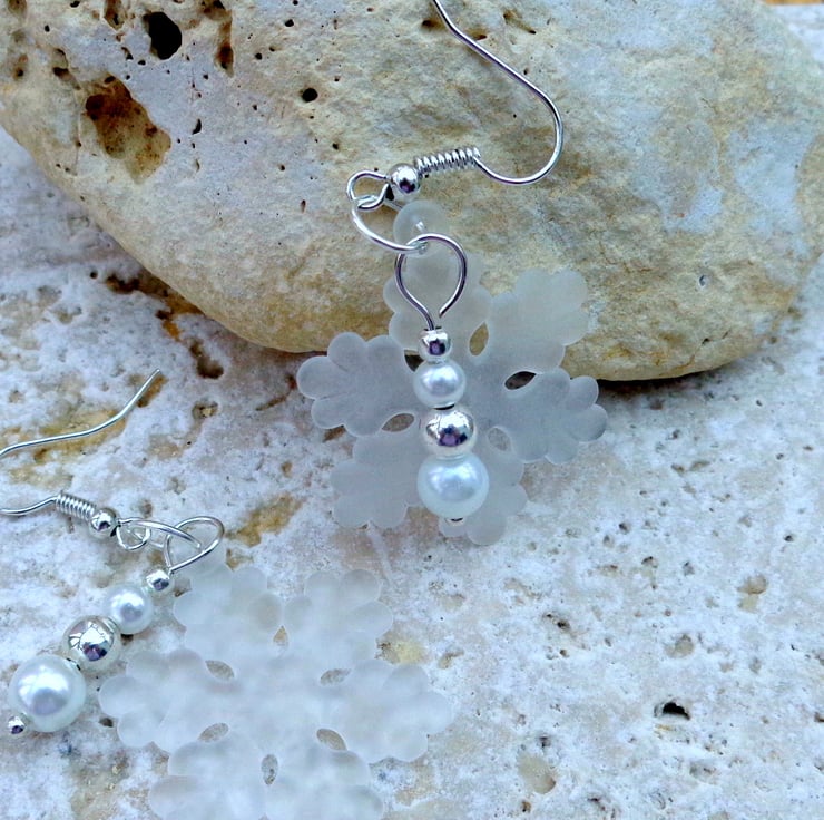 Light, bright, white snowflakes, made of lucite, they look like frosted glass but weigh almost nothing. The dangles are silver & white glass pearls so add sparkle with movement.