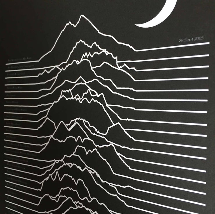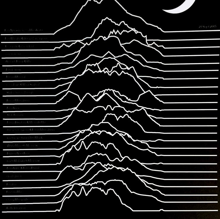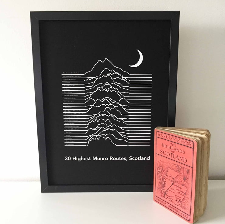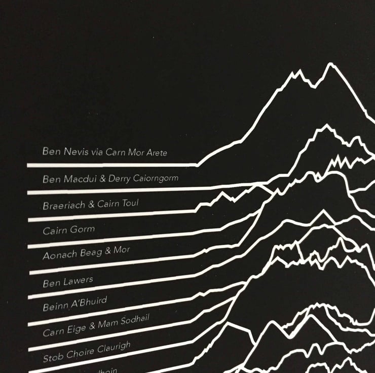 The print in the photos shows the 30 highest Munros as contour routes – most likely the route you took to the top. It displays this in a unique way, inspired by Joy Division’s ‘Unknown Pleasures’ album cover. On the left side of each contour is the name of the Munro route.