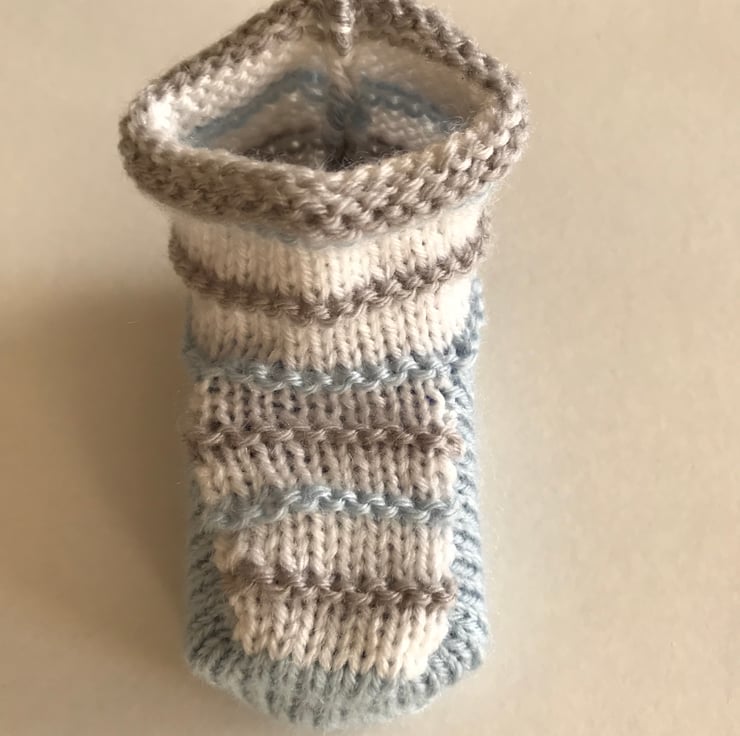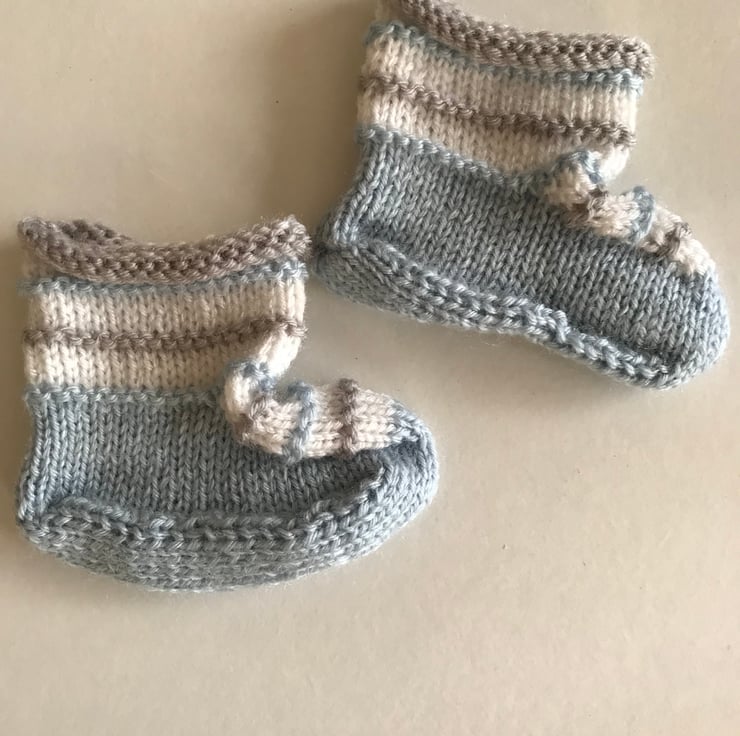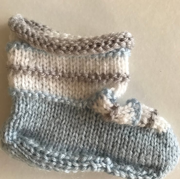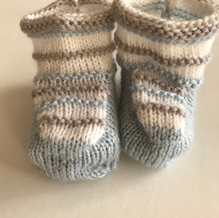 These bootees are hand knitted using a vintage pattern but in a modern yarn. The bottom of the bootee is blue and the upper part is white with blue and grey stripes.
