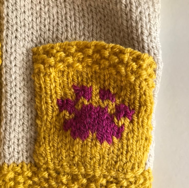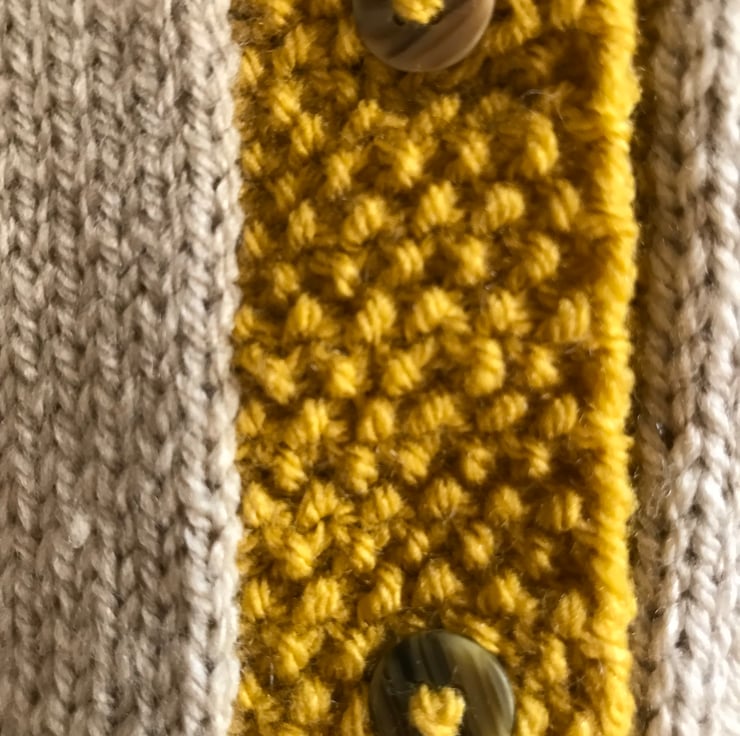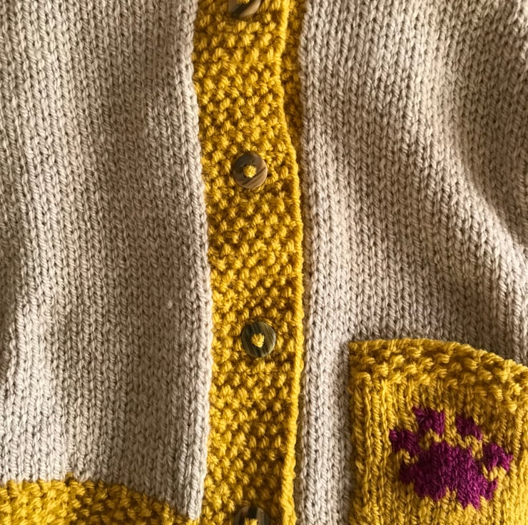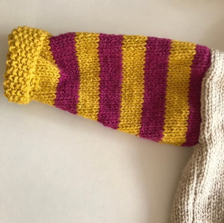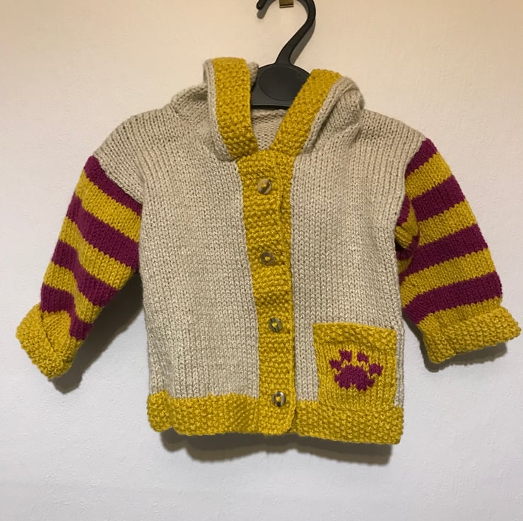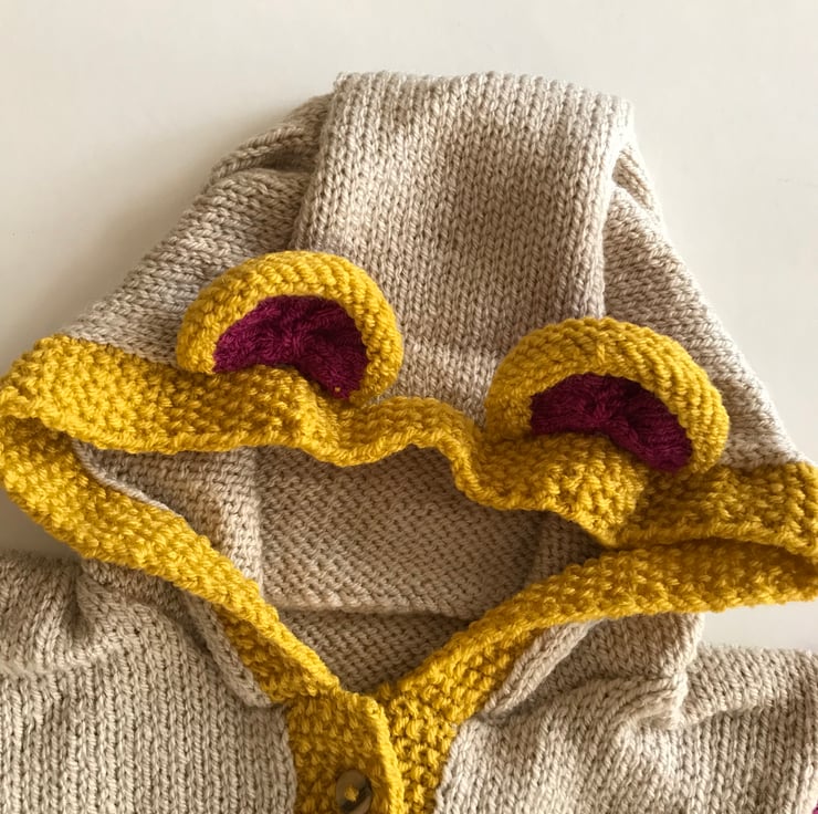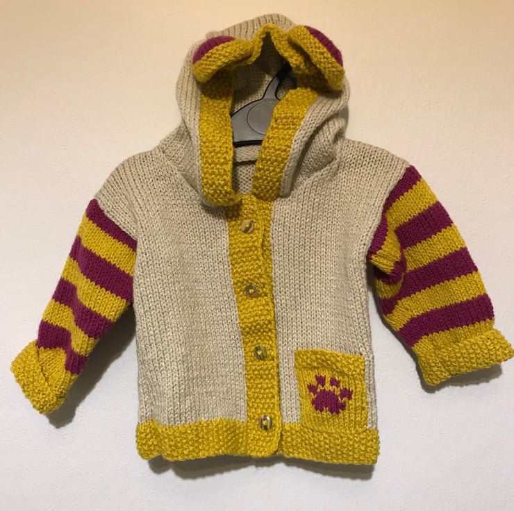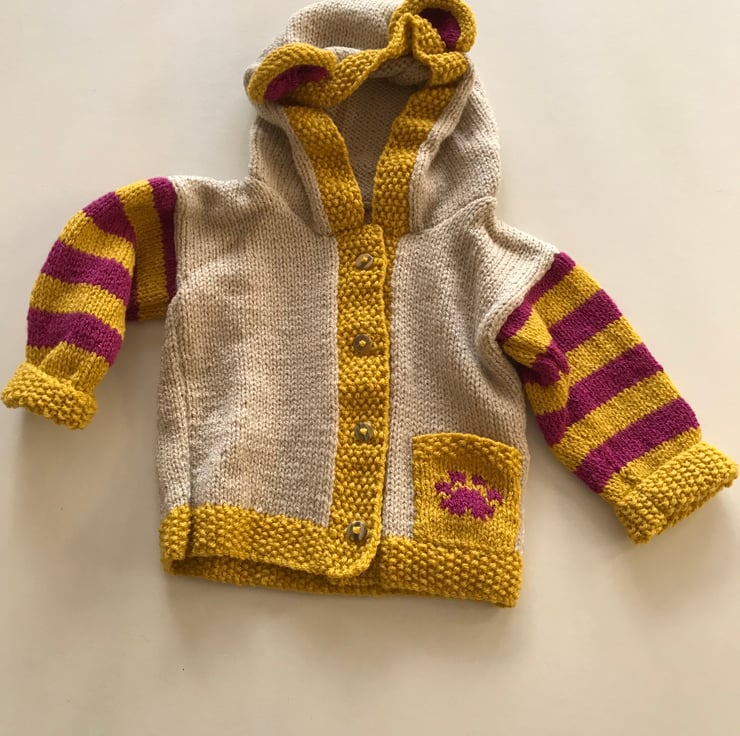 This adorable teddy jacket is handknitted in a soft acrylic yarn. It uses contrasting colours which make it stand out. The sleeves are striped in mustard and plum and the moss stitch edgings and turned back cuffs are mustard. It has a mustard pocket with a bear print on it and it has ears sewn on to the hood. The jacket buttons at the front up to the neck.