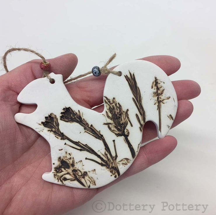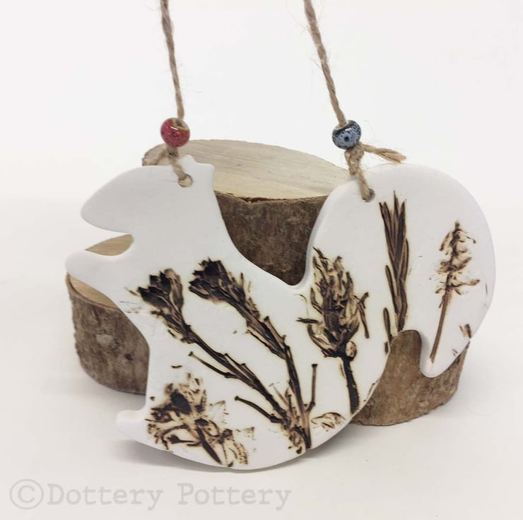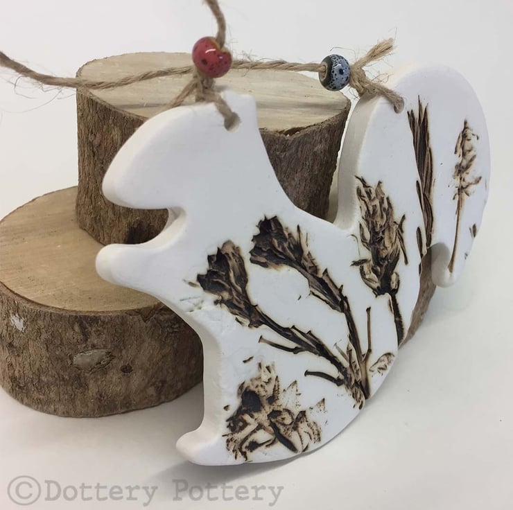 These cute little squirrels are made from white earthenware clay and finished with an imprinted leaf and flower design. They are then fired and finished with oxide, then fired again. It hangs on a brown string and is finished with teeny ceramic beads (colour of beads may vary) - ready to hang on your tree. Each decoration measures 10cm x 8.5cm and is glazed on the front only.