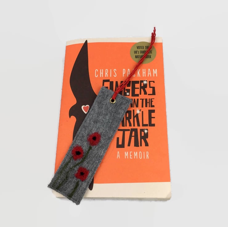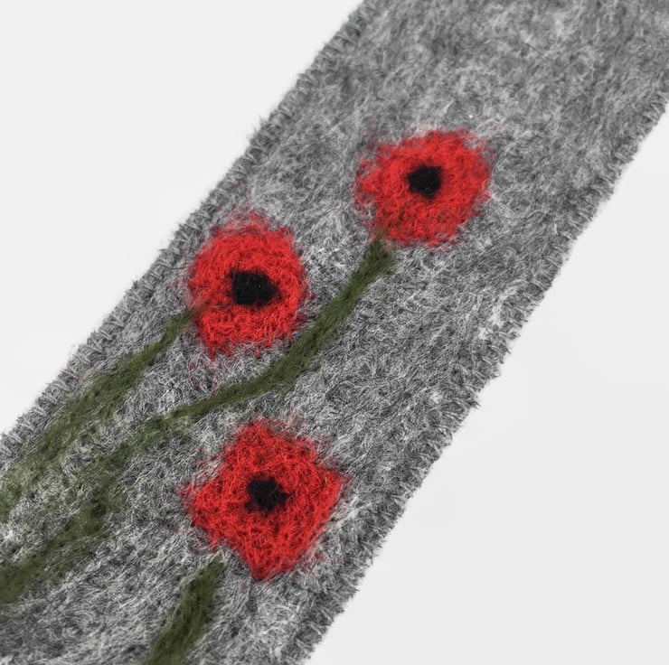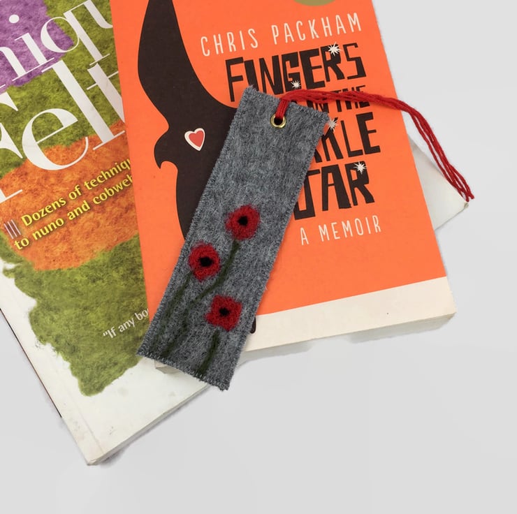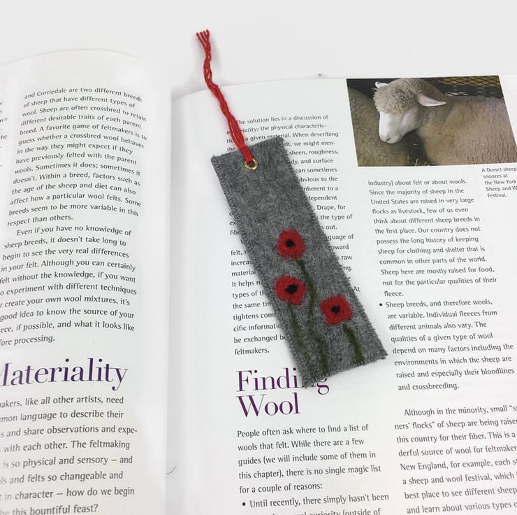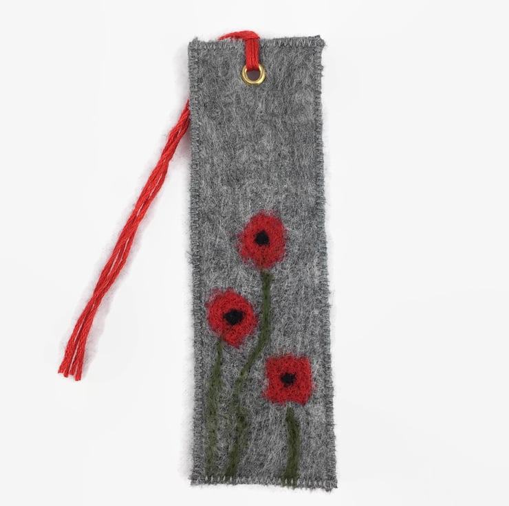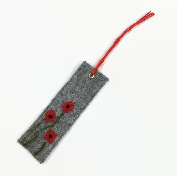 A useful and pretty bookmark made from a piece of hand made felt. This bookmark has been made using grey merino wool fibres that have been wet felted. A decoration of 3 bright red poppies have been needle felted onto the felt. It has been slightly stiffened using interfacing and backed with grey polycotton fabric. A rivet has been inserted at the top edge and red embroidery thread added.