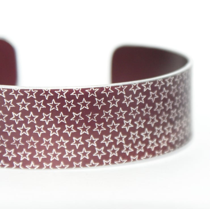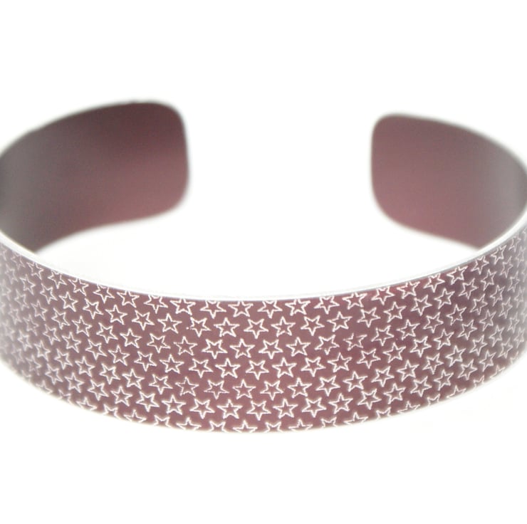 A stylish bracelet/narrow cuff made from anodised aluminium with a mini print of stars. I drew this pattern digitally, made it into a resist and applied it to the metal. I then dye the aluminium, seal it and remove the resist which leaves the pattern showing in the original colour of the metal. The cuff is then made using traditional metalworking techniques.