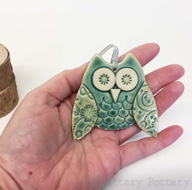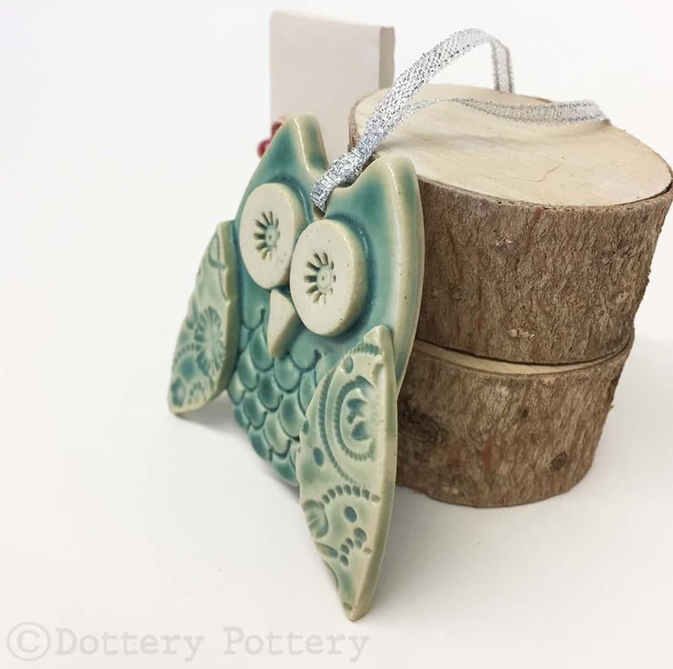 This cute little owl is made from white earthenware clay. Each part has been embossed with pattern and then cut from hand made templates. It has been decorated witha lovely sea green glaze and finished with a silver string It measures 7cm high by 6cm wide by 1.5cm deep. Glazed on the front, plain cream clay colour on the back.