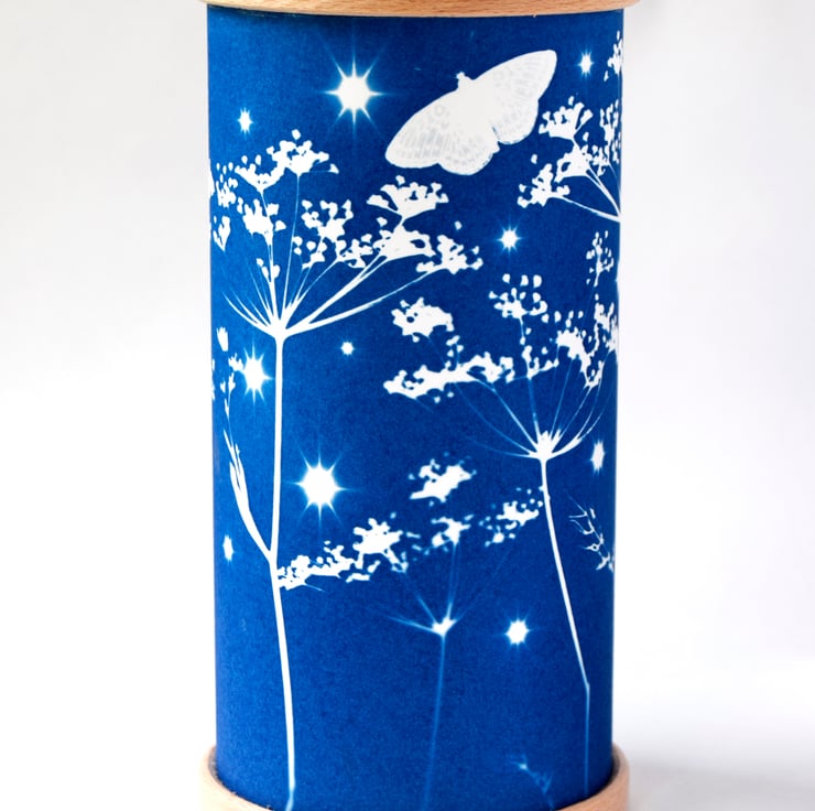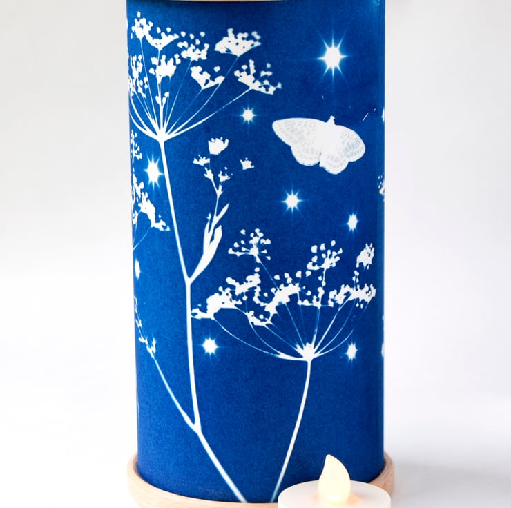 A unique blue Cyanotype candle cover with Fennel, Moths and Stars. When used with the flameless flickering tealight provided a beautiful warm glowing scene is created.