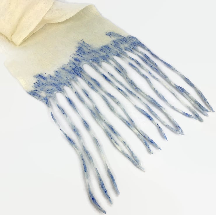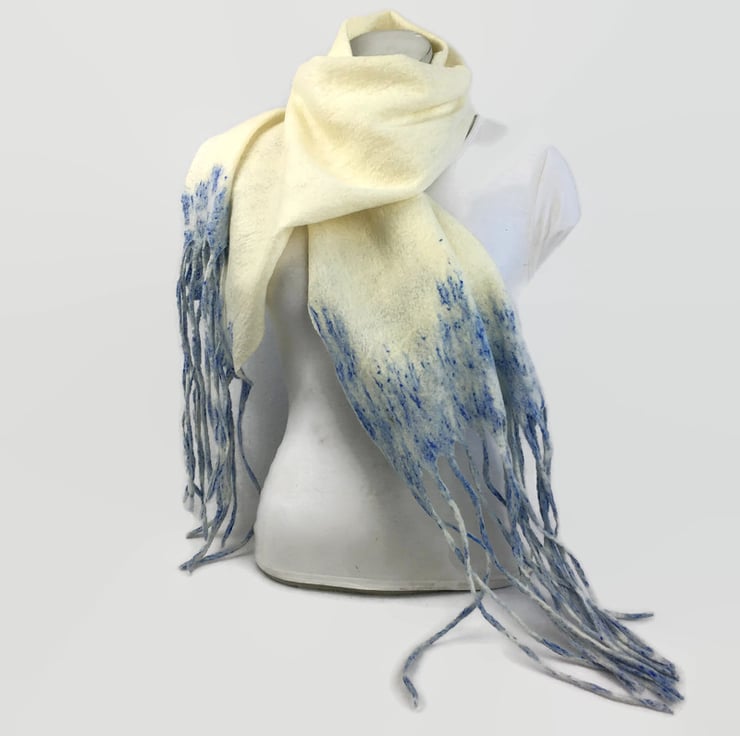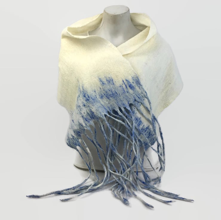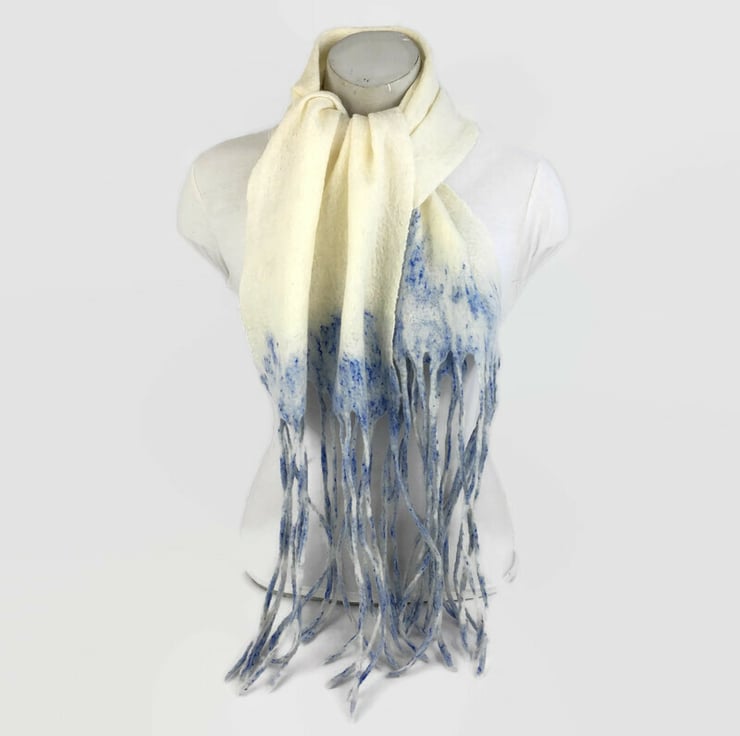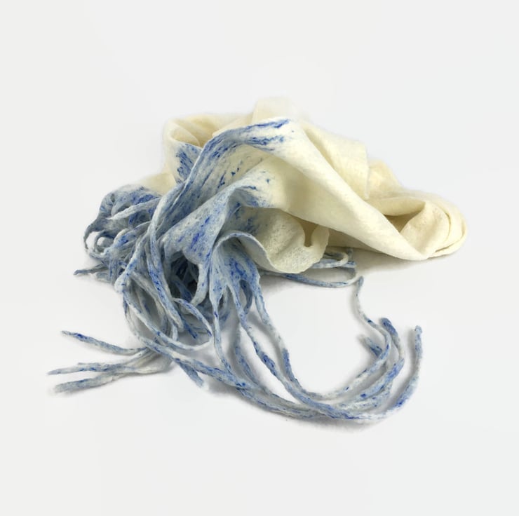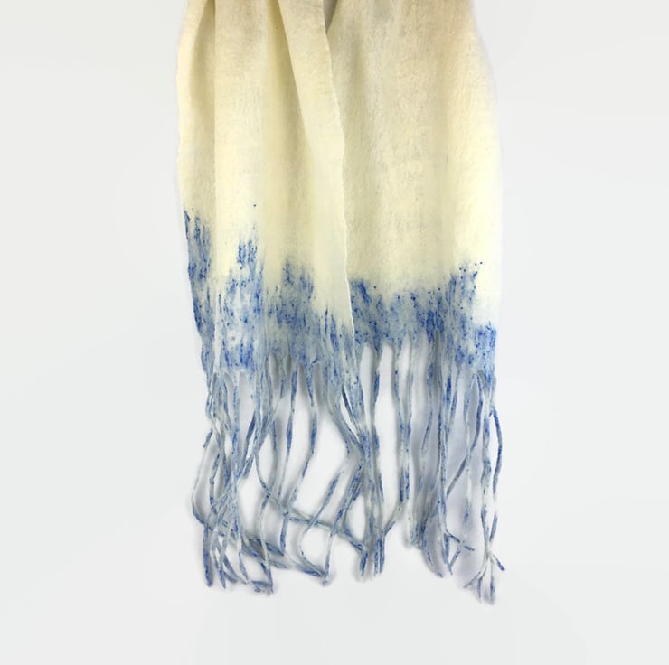 A blend of white wool and blue silk fibres has been added to the ends of the scarf creating a splash of colour with a speckled effect. Tassels have been formed at both ends of the scarf.