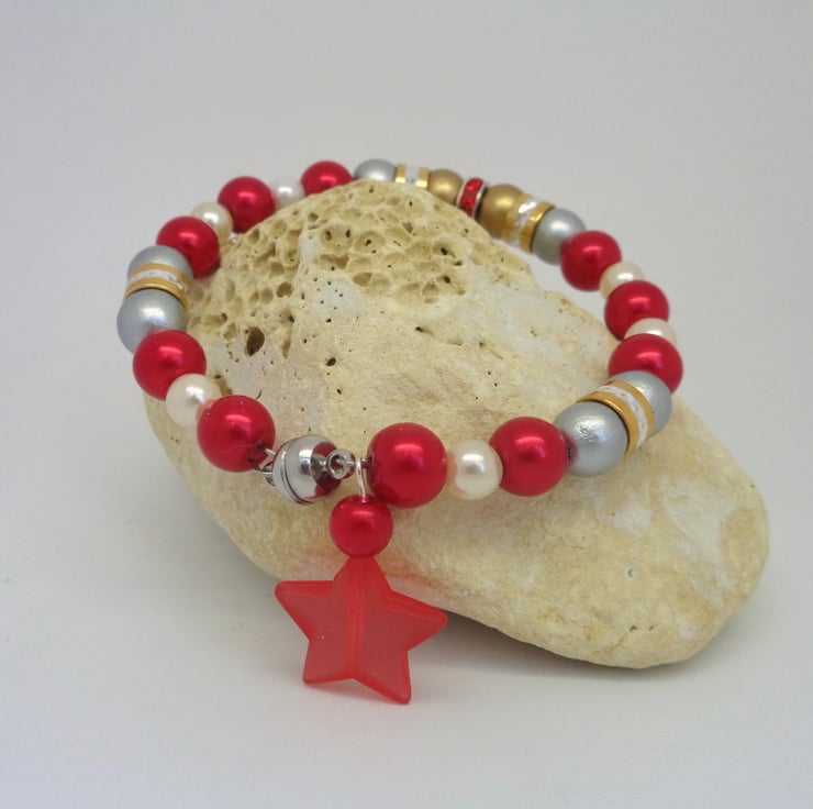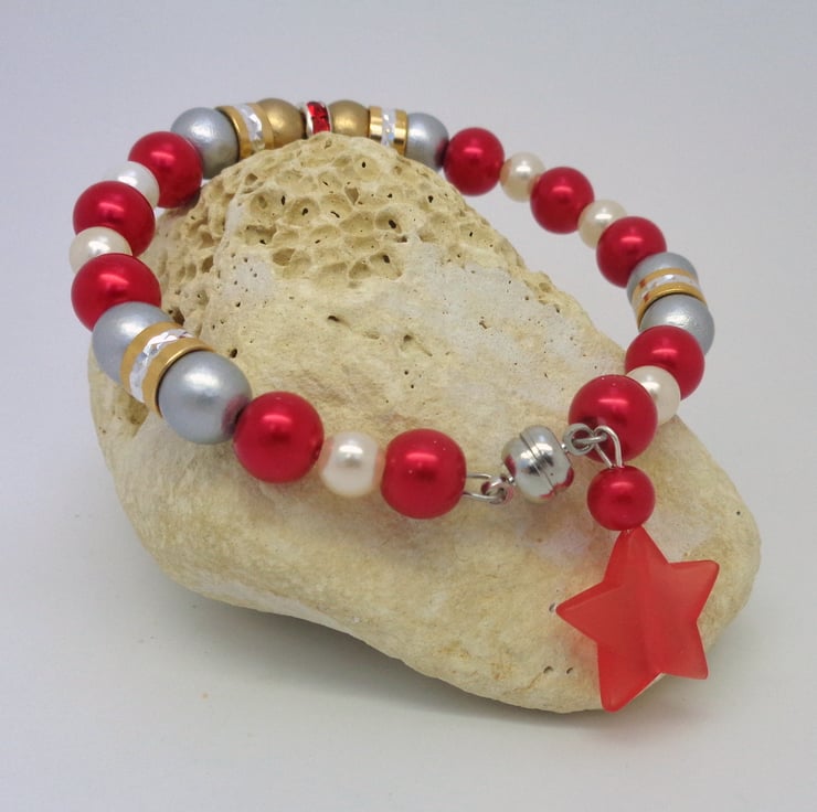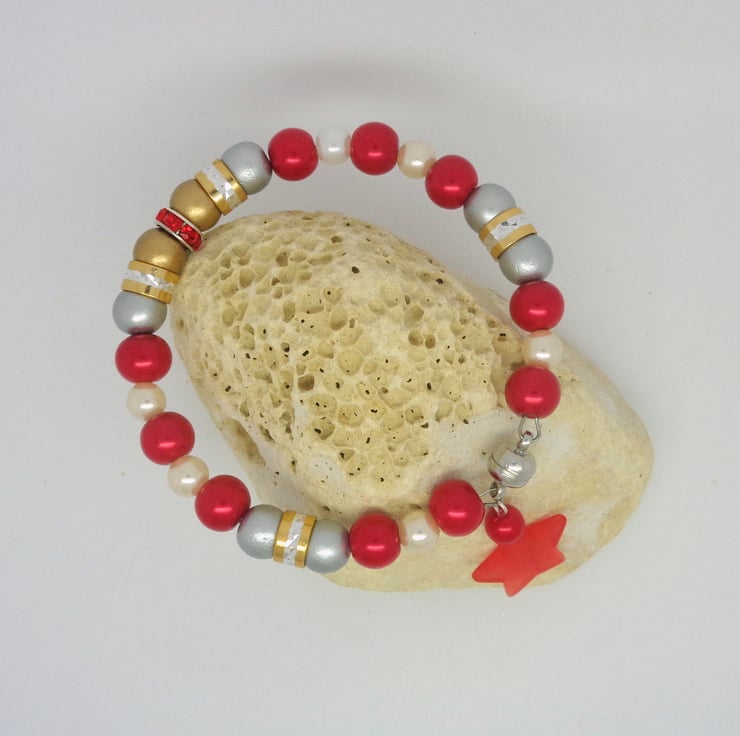 Shiny red & white glass pearls, smooth gold & silver beads & gold & silver metal spacers all set off with a red lucite star charm. very Christmassy!