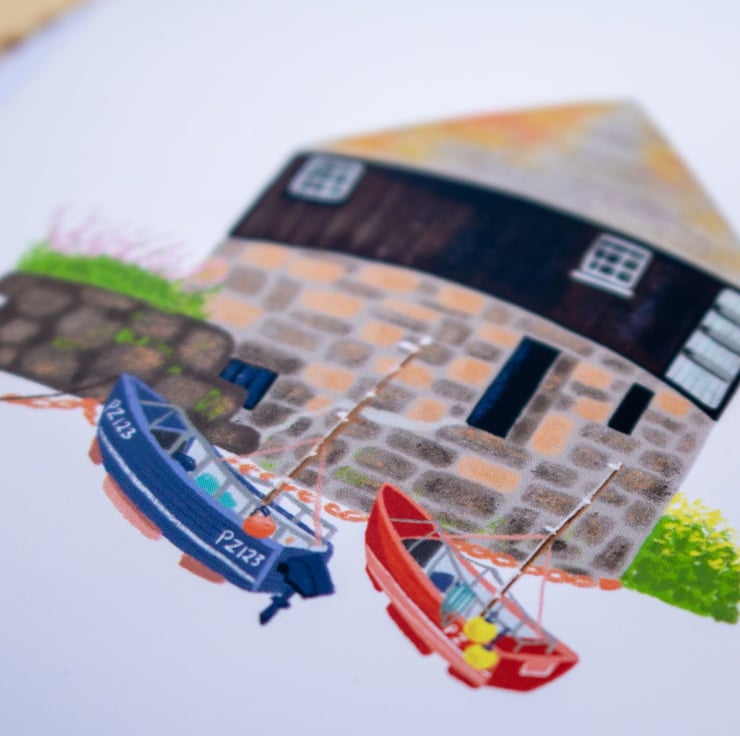 Sennen Cove is one of my families favourite places and is just right around the corner from where I live. It has such a lovely beach and the harbour is so picturesque. The Roundhouse is such a quirky building which has been turned into a gallery and sells some fantastic local art and crafts. This illustration was so much fun to create in my colourful whimsical style.