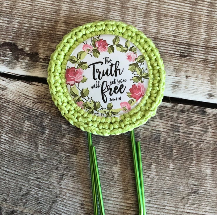 Fabulous jumbo planner clip bookmark that I have made crocheting the edges with beautiful yarn & Bible scripture digital image covered in clear epoxy resin sticker .. fabulous for your planners, journals etc ..