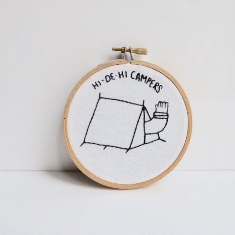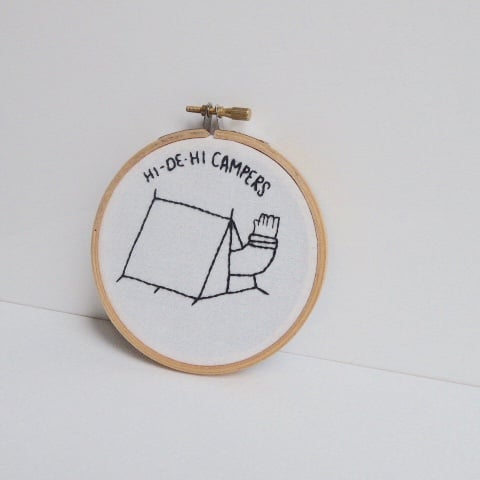 It shows an arm waving out of a tent with the banner headline 'Hi de hi campers' stitched at the top.