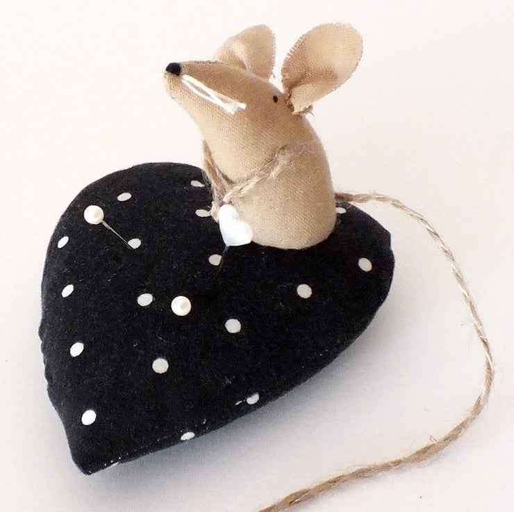 The heart shaped pin cushion is made from cotton fabric stuffed with poly. and measuring about 10 cms. x 8cms. Mouse is about 6cms tall and has a penny in his base for rigidity. The arms and tail are made from jute.