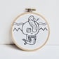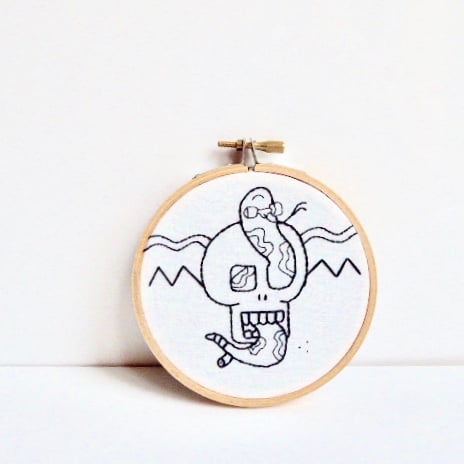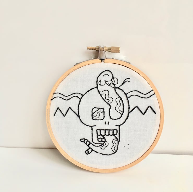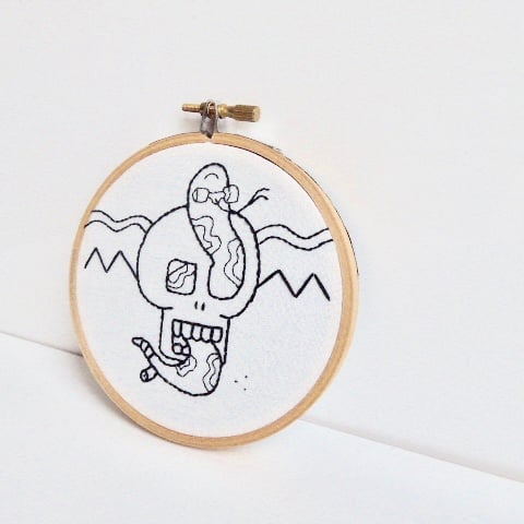 This embroidery hoop has a hand stitched design of a skull with a snake skateboard deck and wheels in black on a off-white background. It has a geometric design in the background.