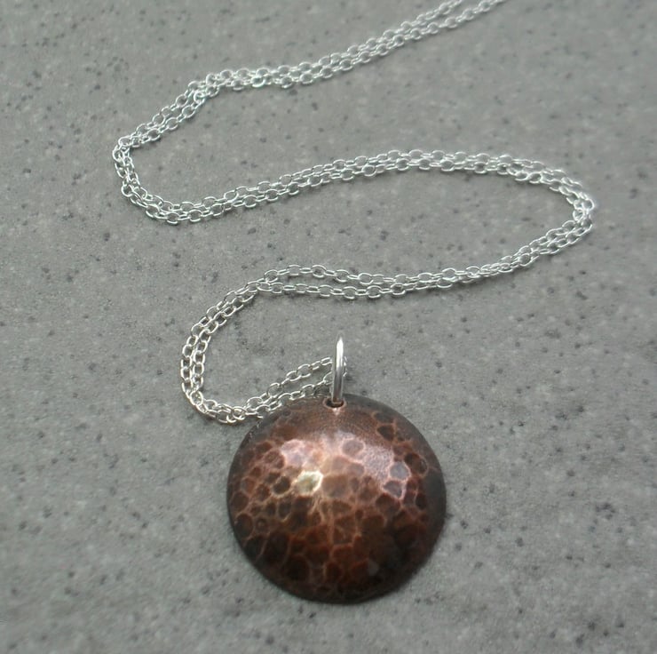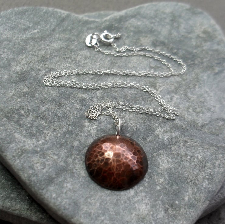 This small Copper domed disc pendant which has been cut from a sheet of copper then the pendant has been ,sanded, hammered to give texture and oxidised to give an aged look. the copper then has had a coat of lacquer to help protect the copper
