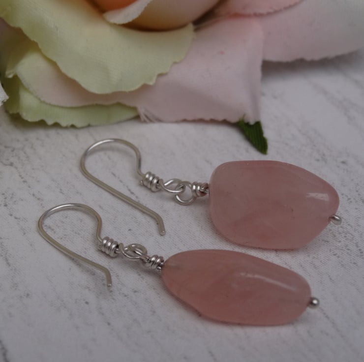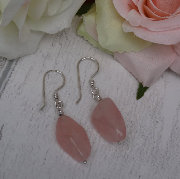 Suitable for every day wear or special occasions, these earrings are made using rose quartz tumble stones and sterling silver wire.
