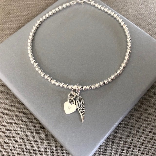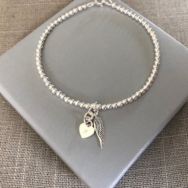 Sterling Silver Heart and Angel Wing Charm Bracelet - made with 3mm Sterling Silver beads, a heart charm and angel wing charm were attached. The bracelet is secured with a Sterling Silver bolt ring clasp.