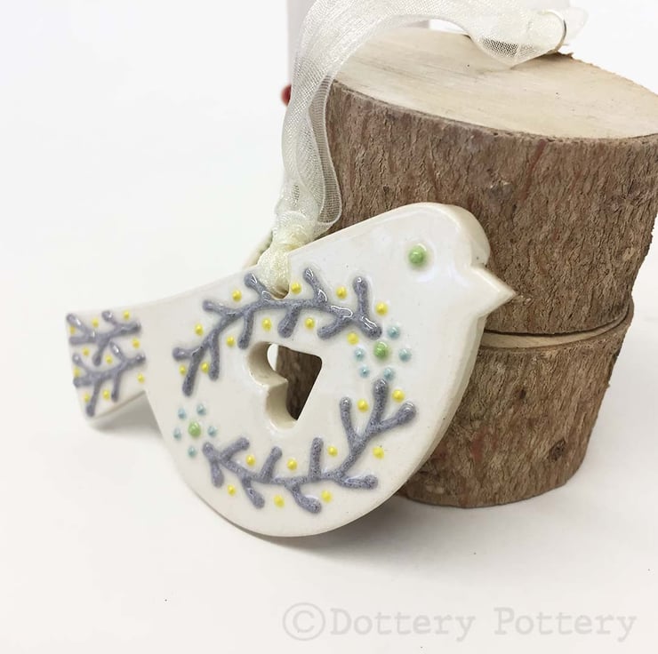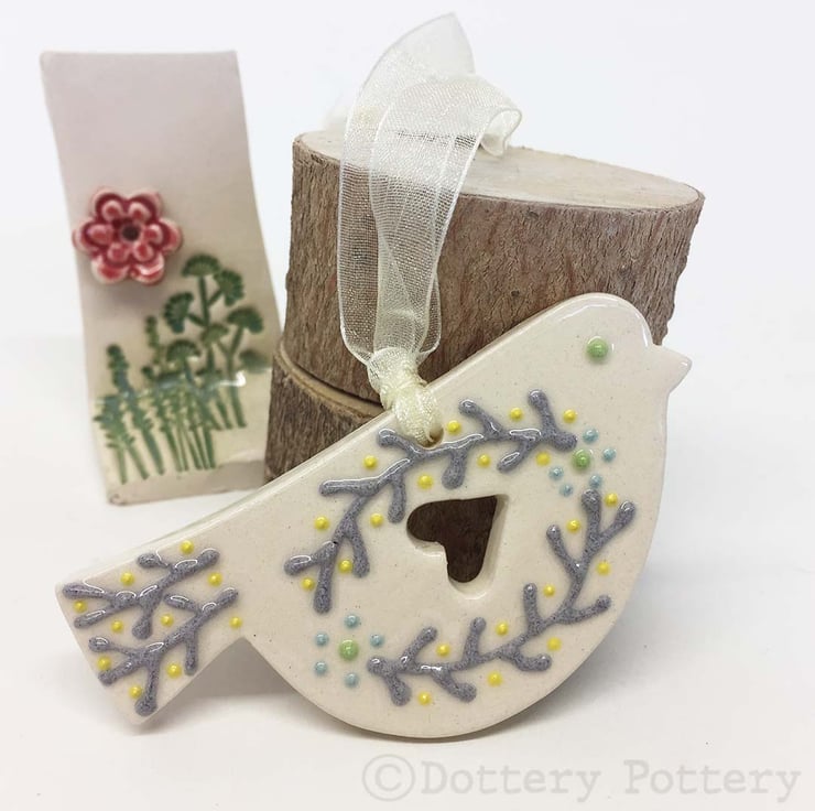 This cute little pottery bird has been hand-cut from a template that I designed myself.