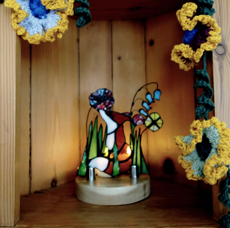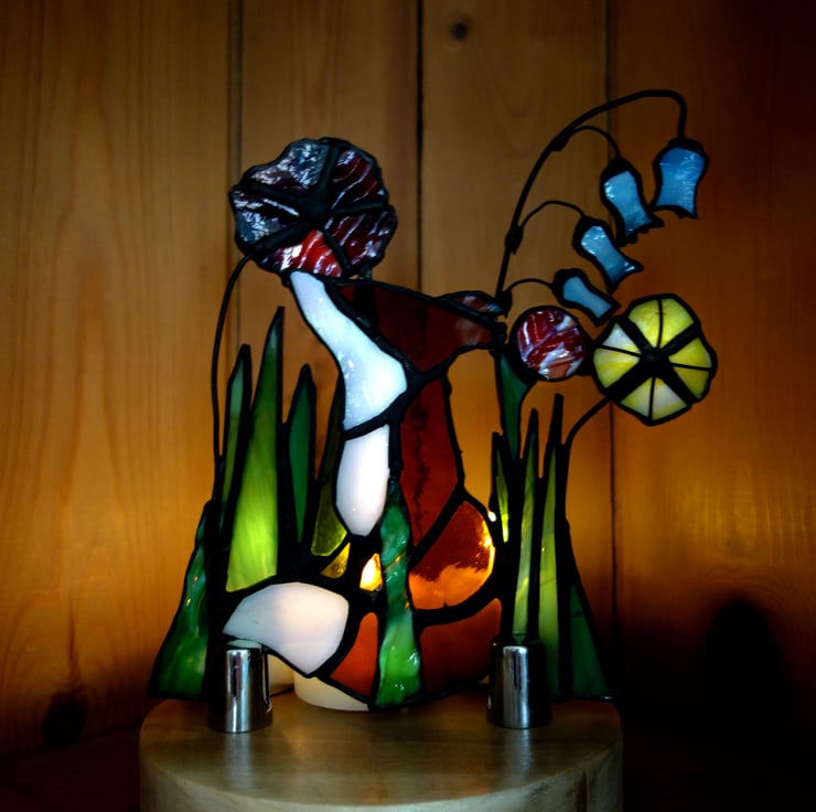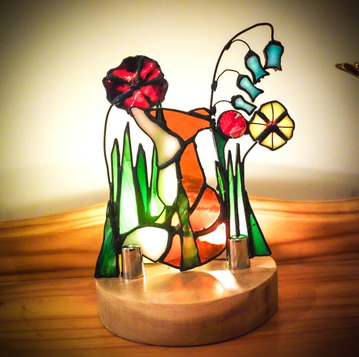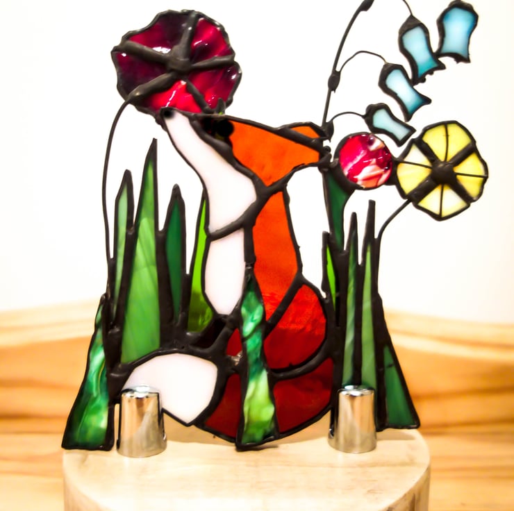 Wee woodland fox sitting in meadow flowers made from a mix of Uroboros textured stained glass and cathedral glass.