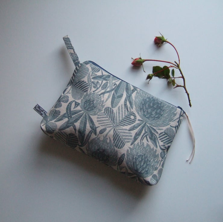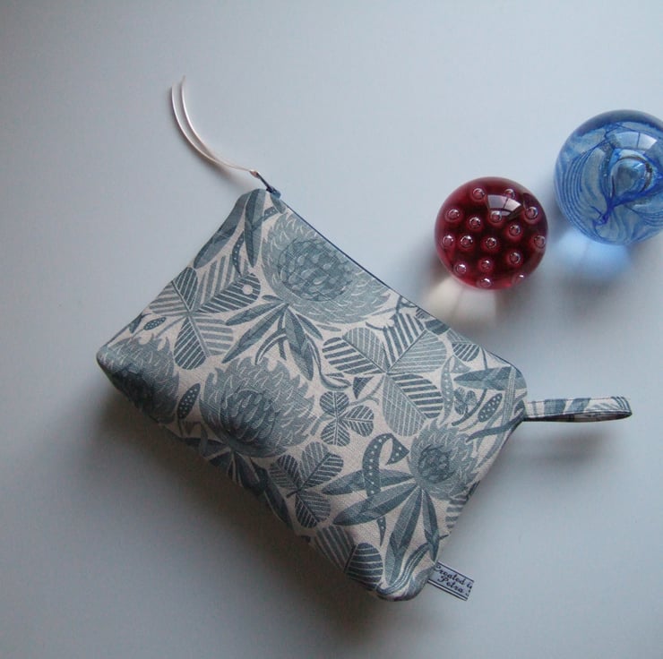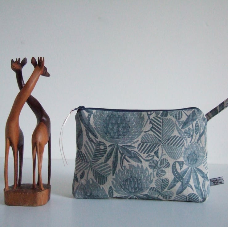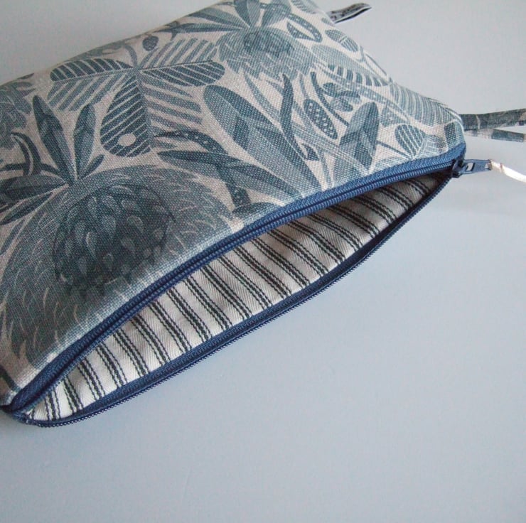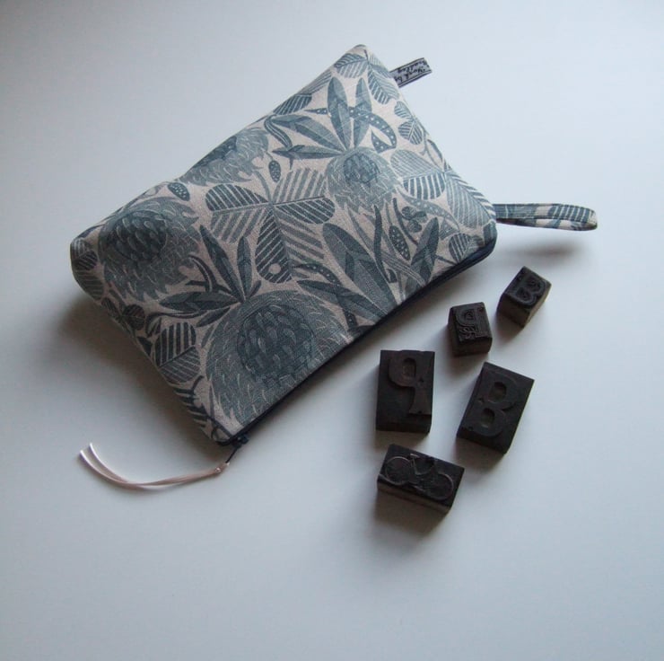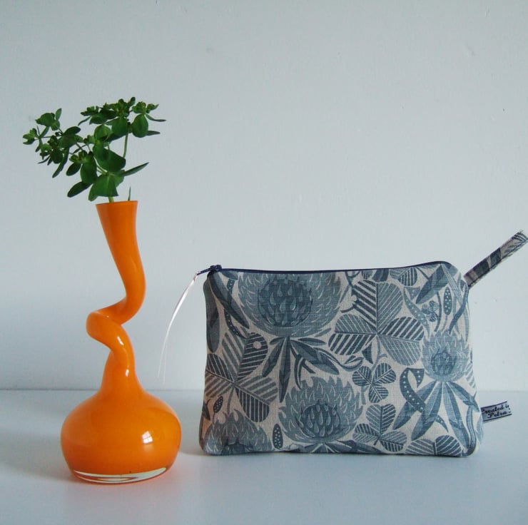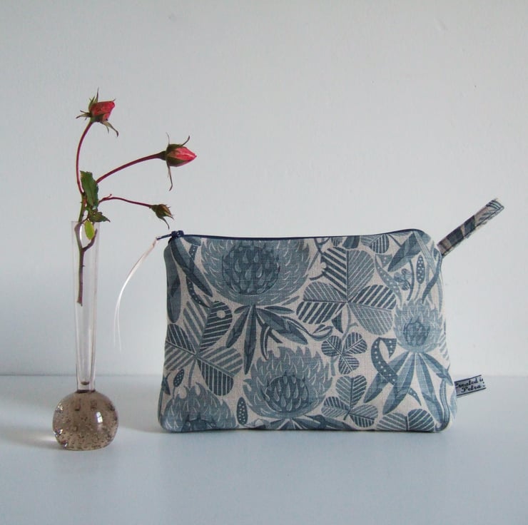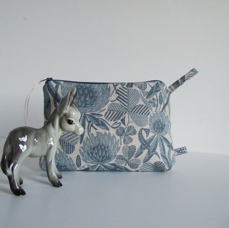 Subtle greys and dusty blue clover designs cover the surface of this neat and practical little make up bag or purse. The bold print is reminiscent of hand cut lino or wood block printing. It is a good size for make up or small amounts of toiletries, and would make a good weekend travel bag, or as a present for someone going away on a trip, or leaving home! See if you can find a four leaf one.