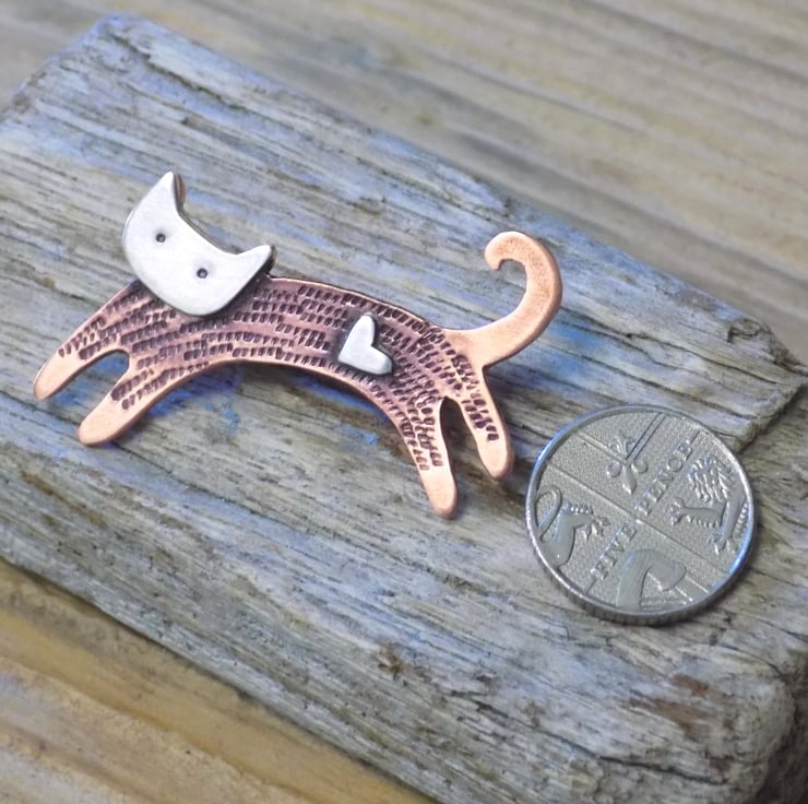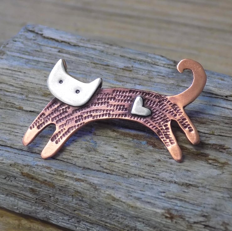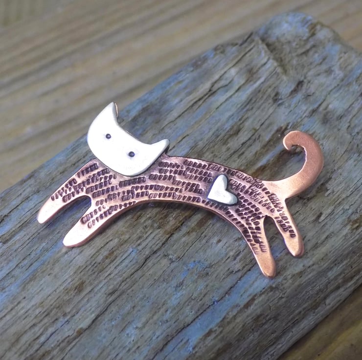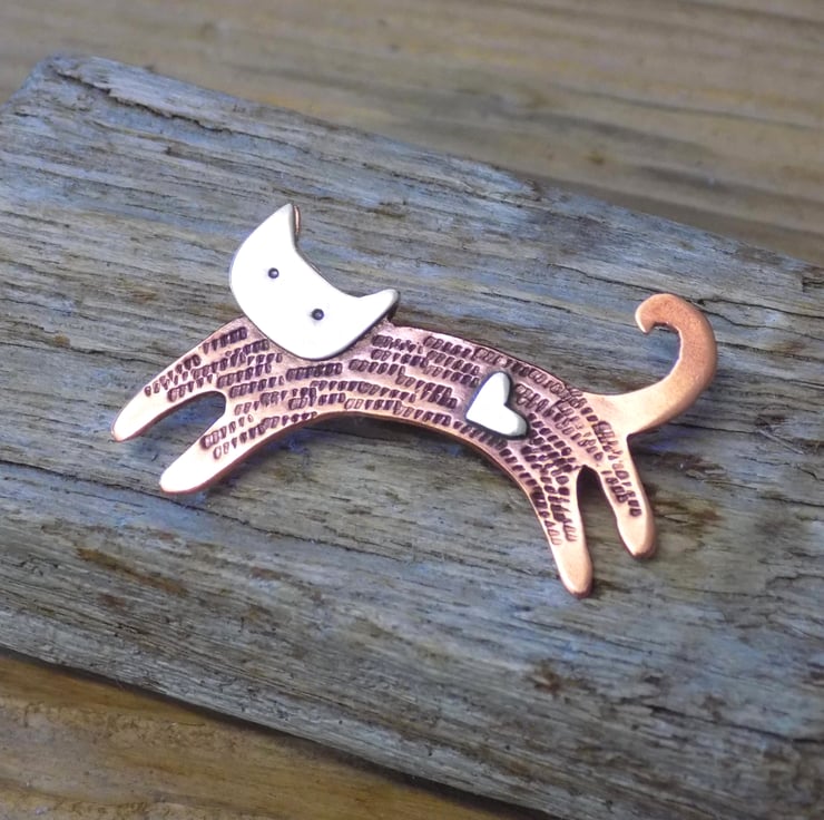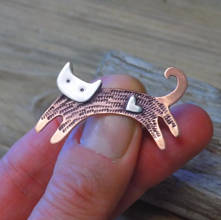 Designed and hand sawn from 1.2 mm thick copper sheet. Each textured stroke has been stamped onto the copper to create the cats coat. The sterling silver cats head has been carefully soldered on and a tiny little silver heart has been added to. The whole pendant has been given an aged effect which picks out all the detail and texture creating a lovely contrast between the silver and copper. A brooch setting has been fixed to the back with very strong jewellers glue.