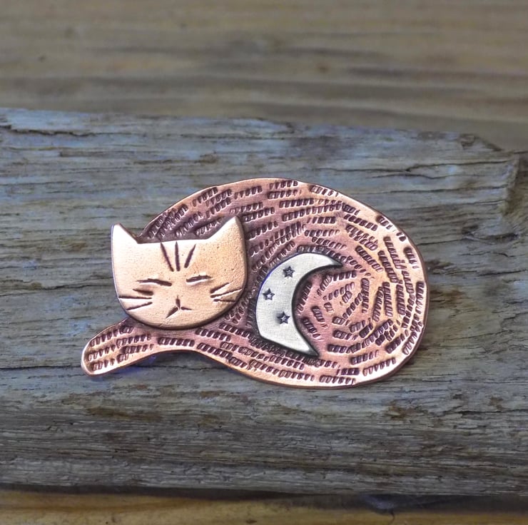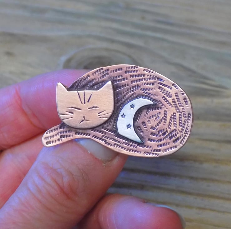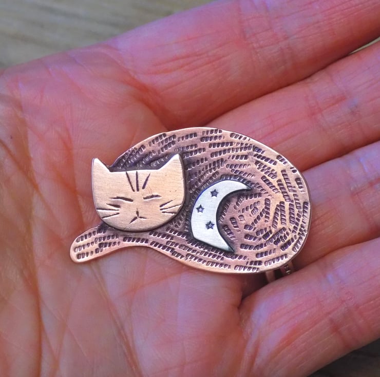 Designed and hand sawn from 1 mm thick copper sheet. Each textured stroke has been stamped onto the copper to create the cats coat. The copper cats head has been carefully soldered on and a crescent shaped piece of sterling silver has been added which has a few tiny stars stamped on it. The whole pendant has been given an aged effect which picks out all the detail and texture creating a lovely contrast between the silver and copper. A brooch setting has been fixed to the back with very strong jewellers glue.