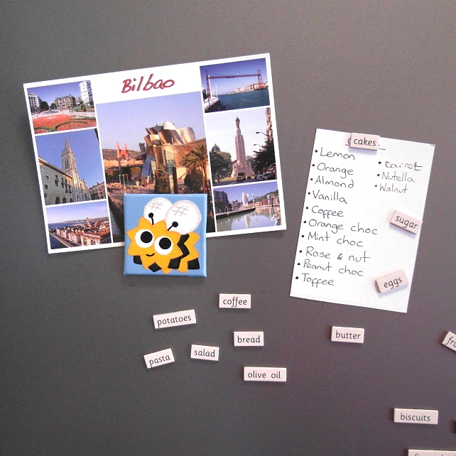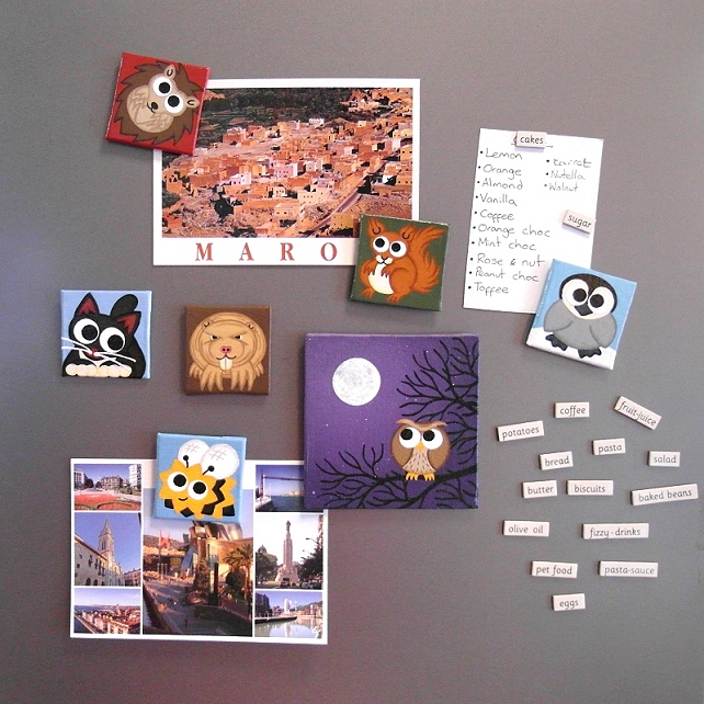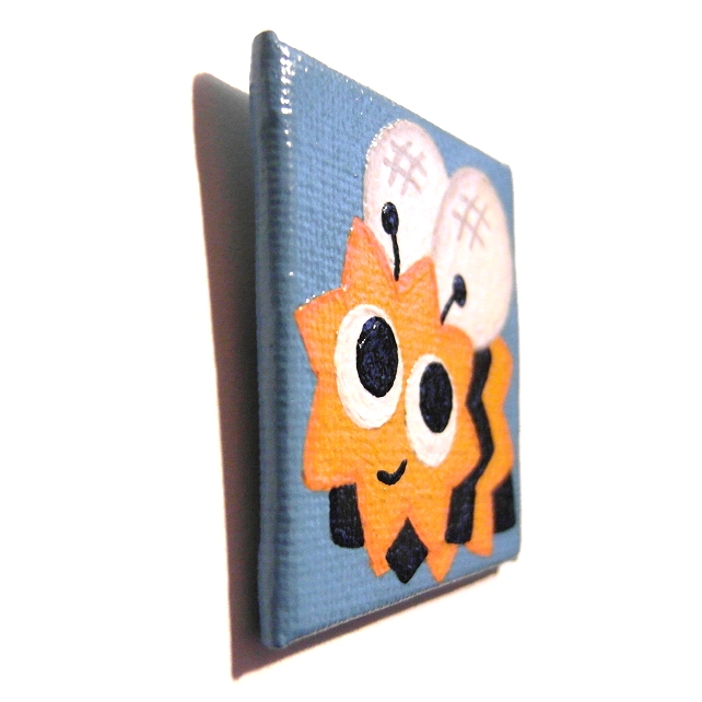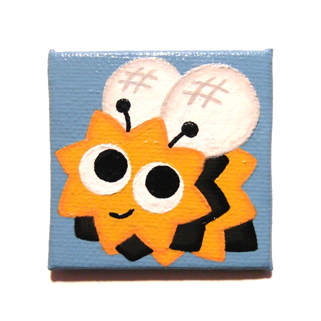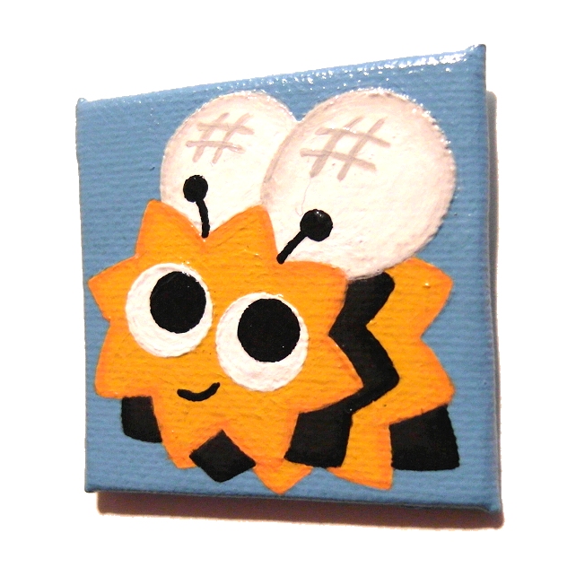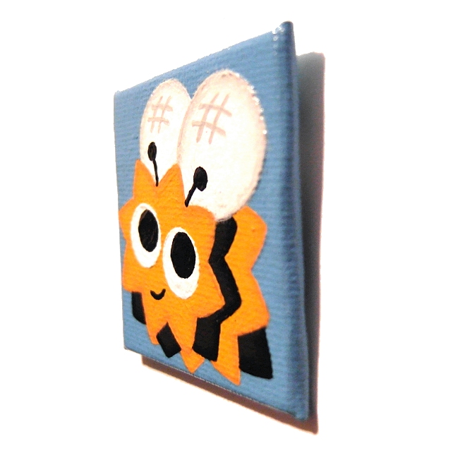 This original bee art is painted in acrylics on a mini 5cm x 5cm (2" x 2") canvas board, and has been coated with a layer of clear varnish to make it more durable. A 12mm magnet is attached to the back so the little painting can stick on a fridge or other magnetic surface.