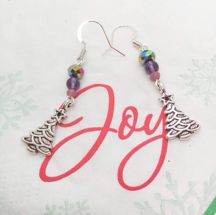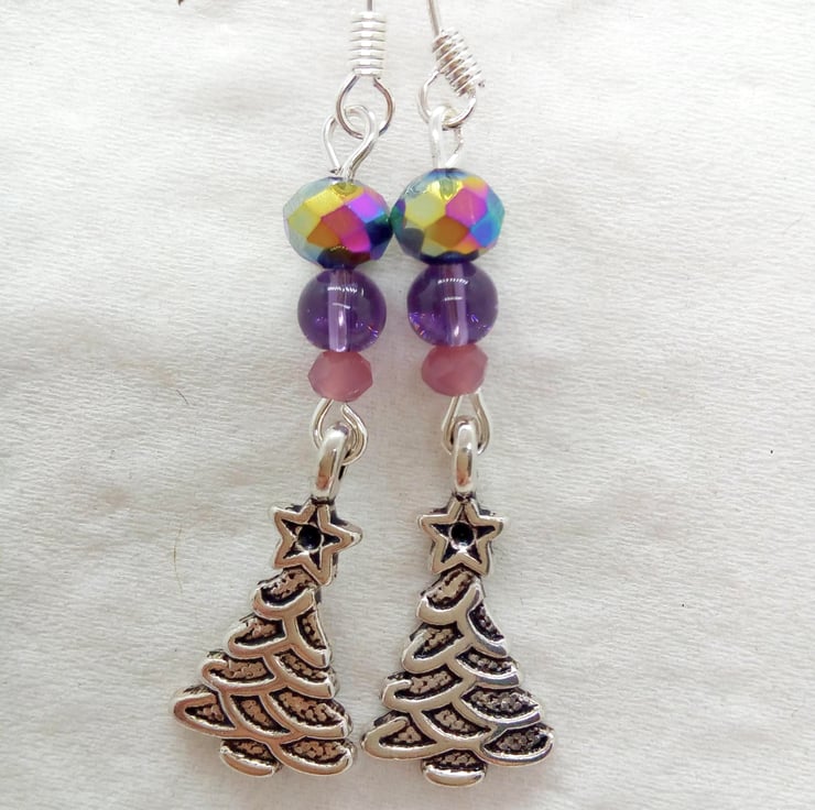 The earrings are made using a small lilac glass pearl bead, a clear purple glass bead and an iridescent blue crystal with a silver Christmas tree charm on silver plated ear wires. They have a drop of 3.5 cm (1.5 inches) from the base of the ear wire.