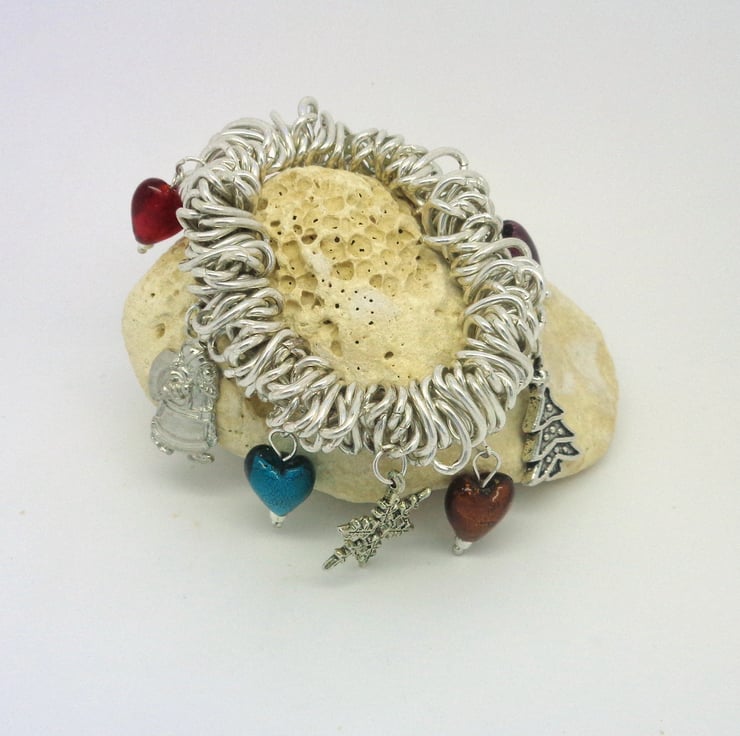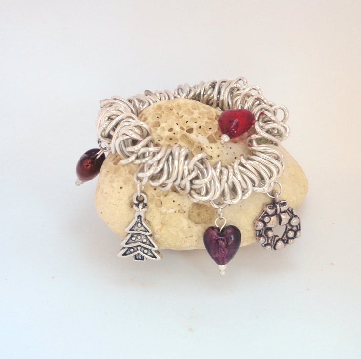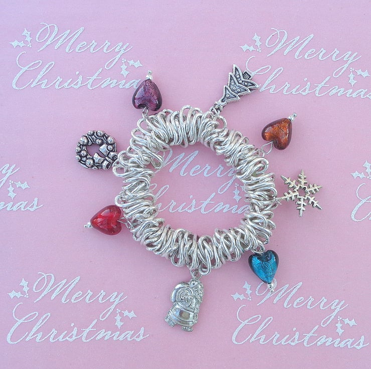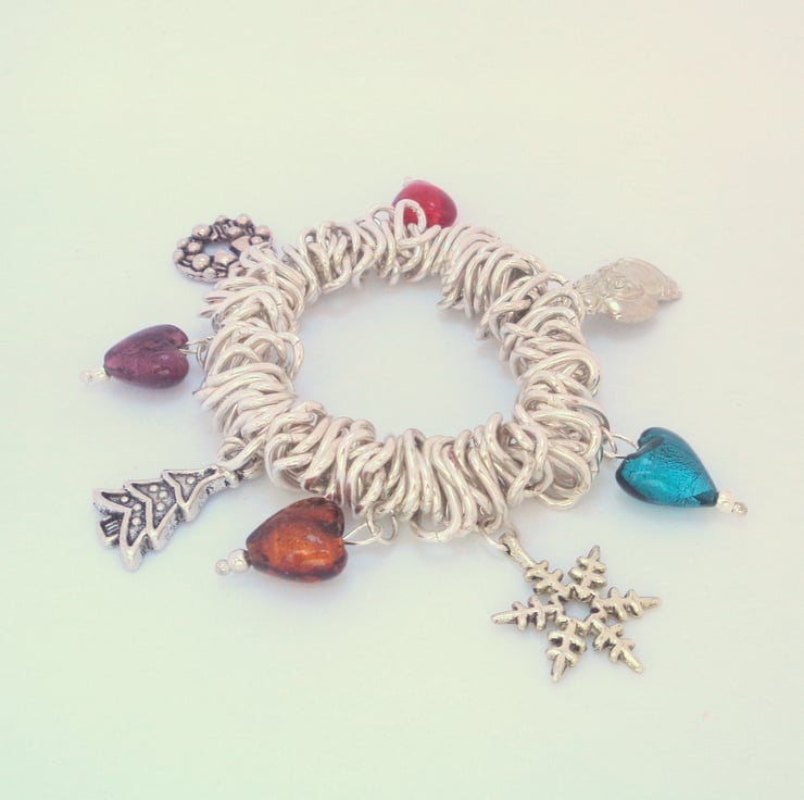 This is a stretchy Christmas themed charm bracelet. In addition to 4 silver metal charms there are 4 foiled glass hearts (teal, chestnut, red & purple)