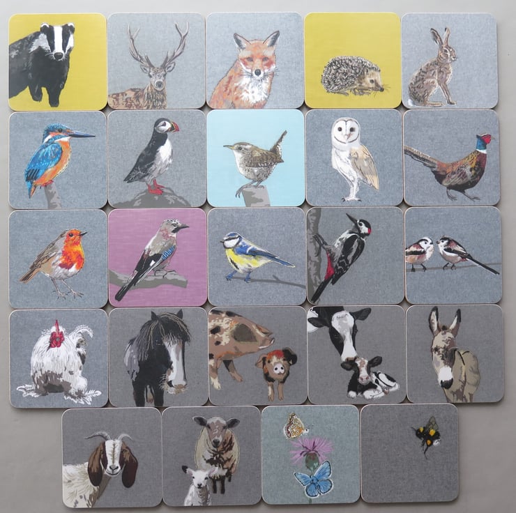 Designs include Hare, Fox, Stag, Badger, Hedgehog, Wren, Jay, Robin, Blue-tit, Kingfisher, Long-tailed tits, Barn owl, Pheasant, Chicken, Puffin, Great spotted woodpecker, Bee, Butterflies, Goat, Friesian cow & calf, Shire horse, Donkey, Sheep & lamb and Pig & piglet