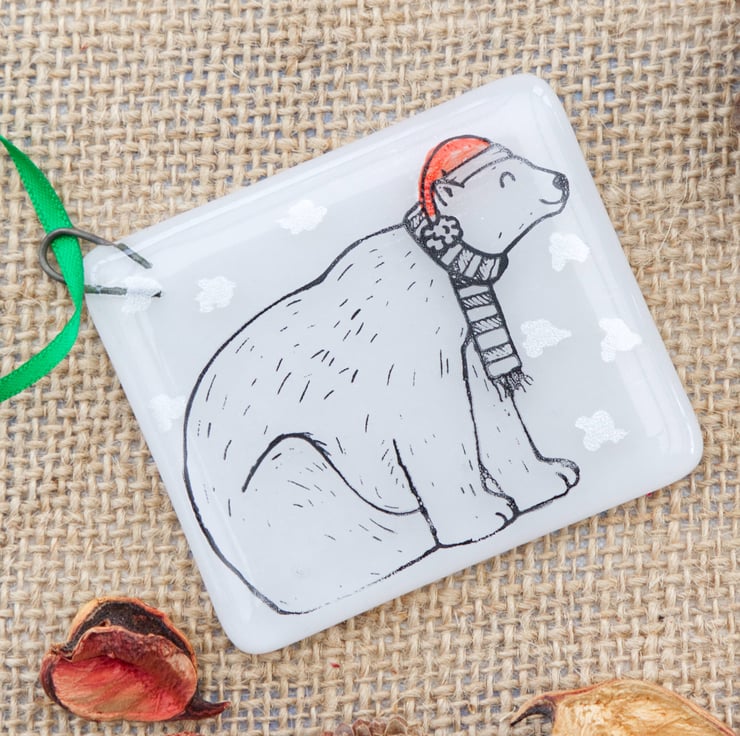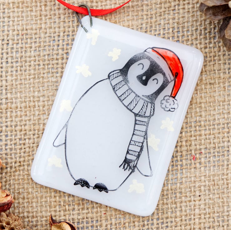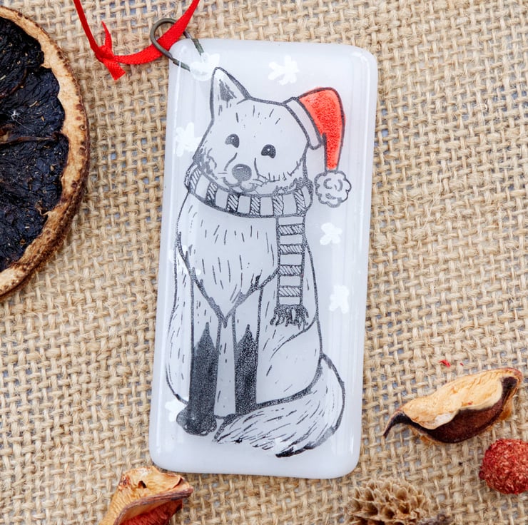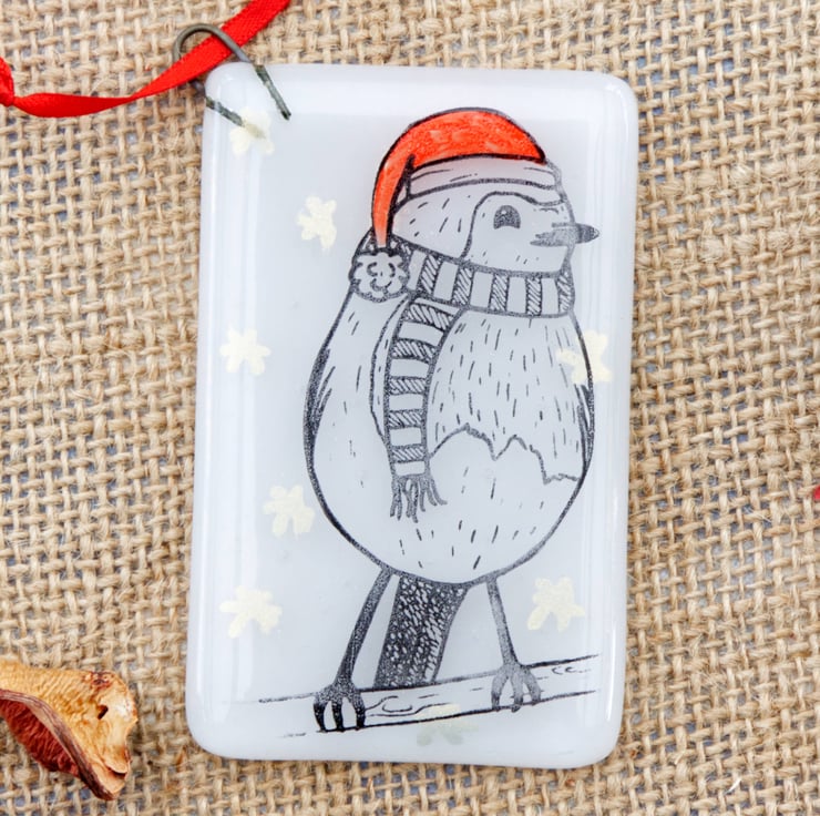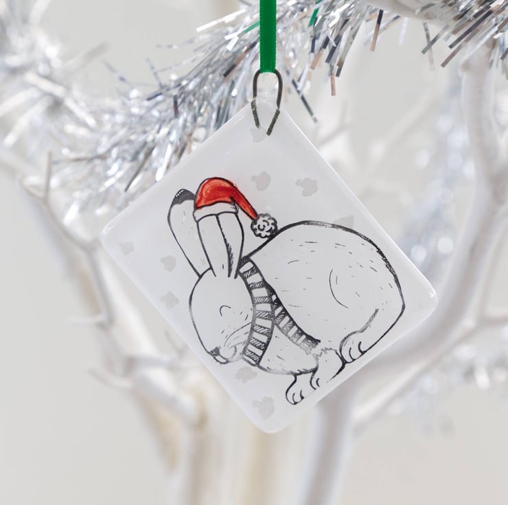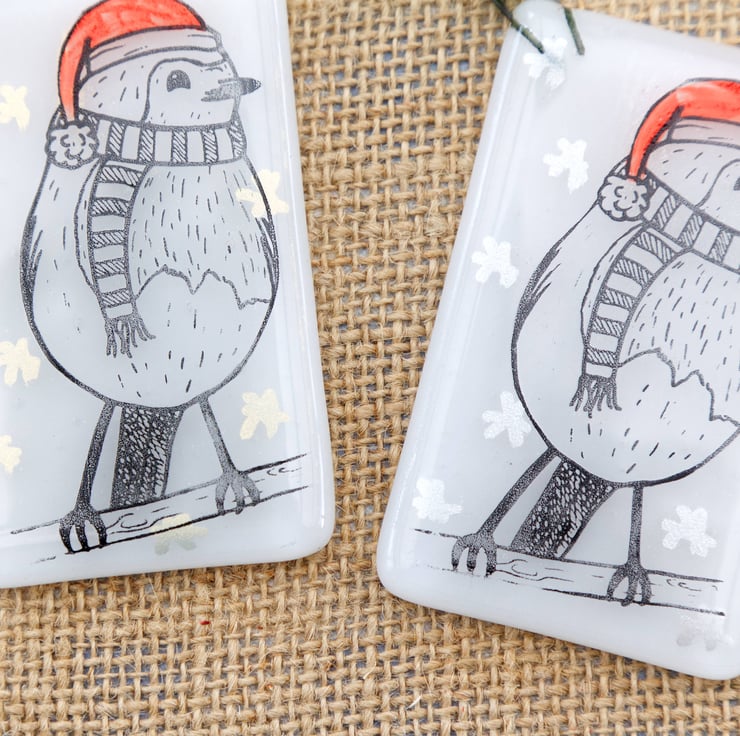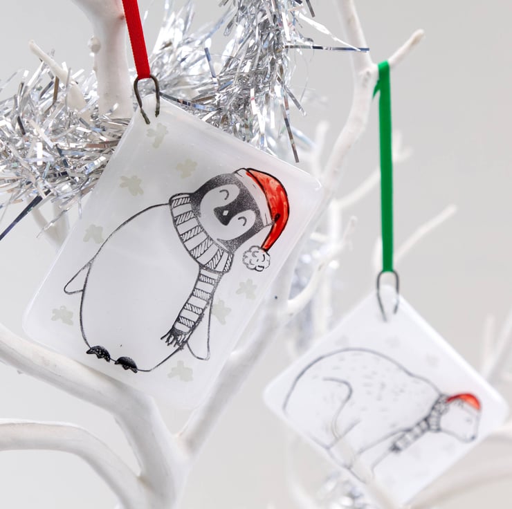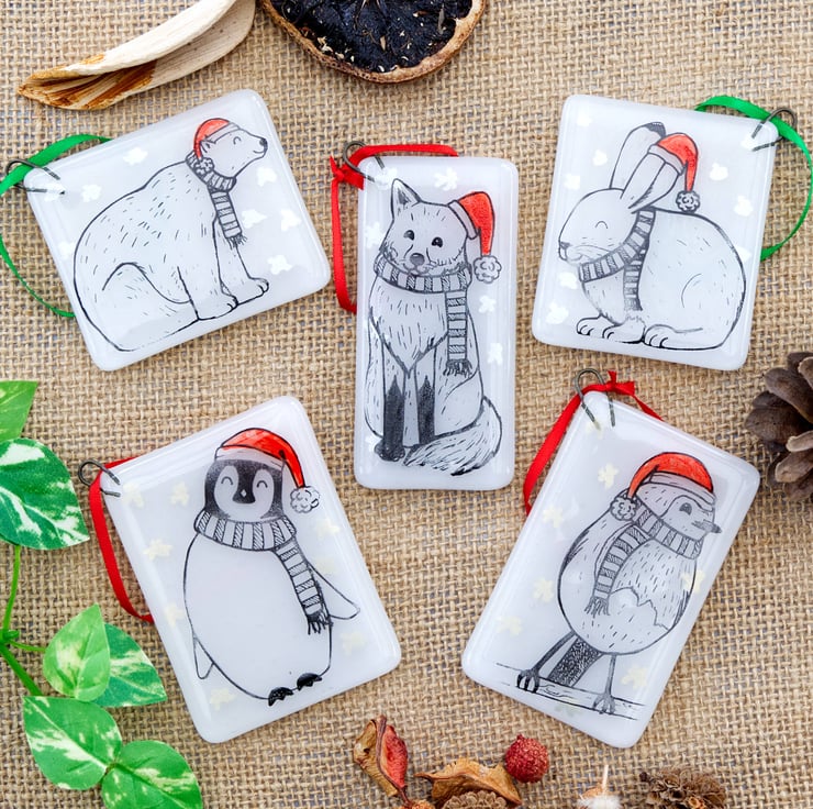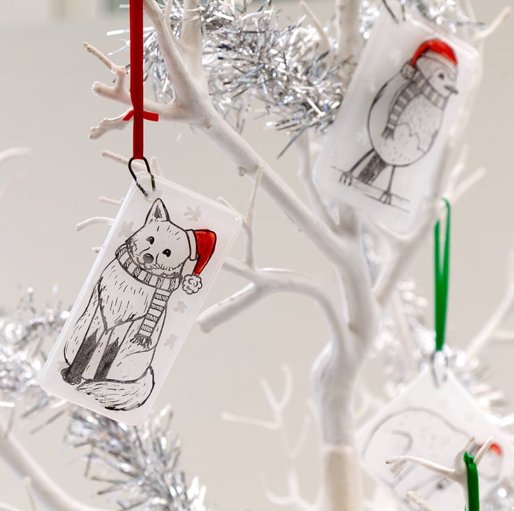 Decorate your tree with these adorable animal Christmas decorations. Each one was originally designed by me, illustrated using pen and ink. The base glass has been cut by hand, painted with red enamel for the hats and embellished with silver or gold mica stars. After melting together, the animals have then been screen-printed onto the glass using enamel that is fully melted into the glass in a second firing in the kiln. This means that they are completely scratch resistant. Due to the handmade and hand-printed nature of these decorations, the one you receive might be slightly different to the ones pictured.