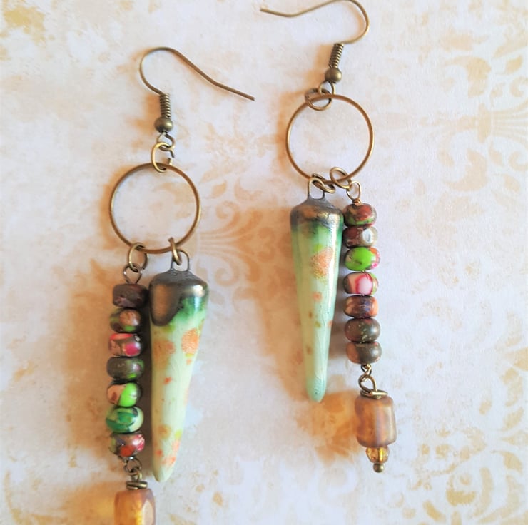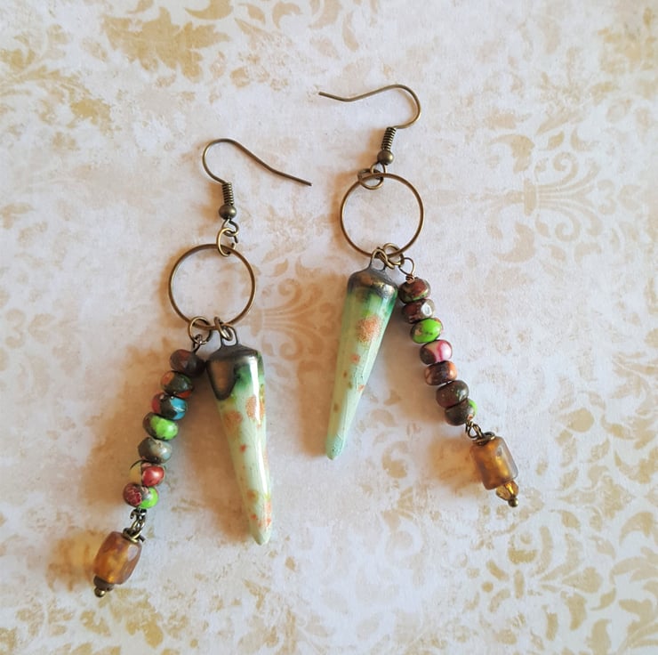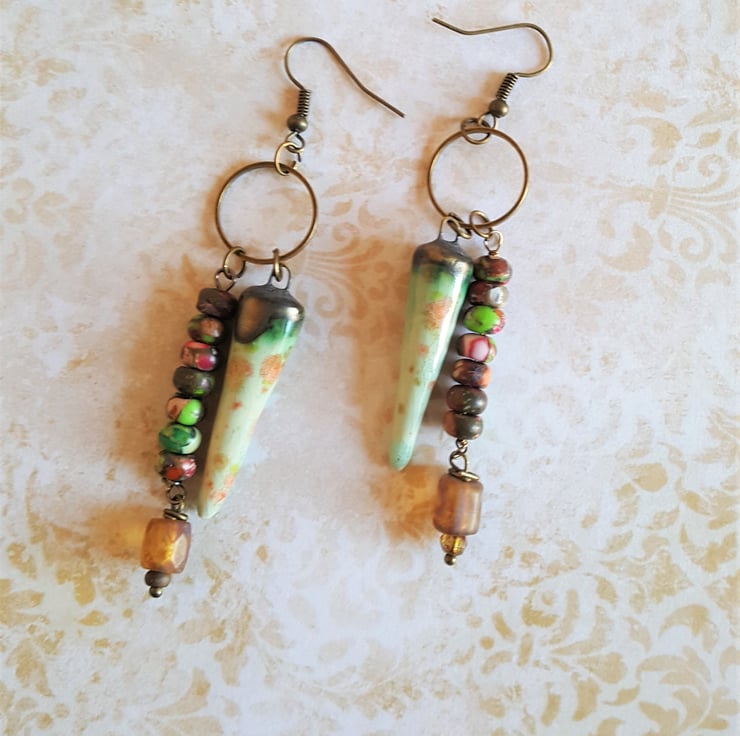 These one of a kind artisan asymmetrical dangle Tribal earrings feature ceramic drops with a beautiful metallic glaze finish. The multi coloured beads give a BOHO vibe and compliment the drops perfectly.