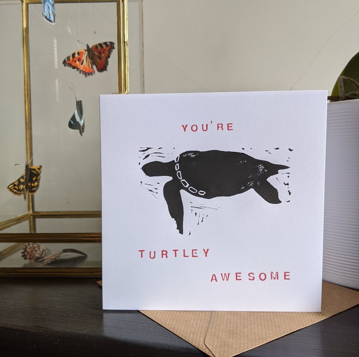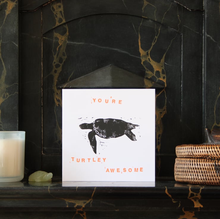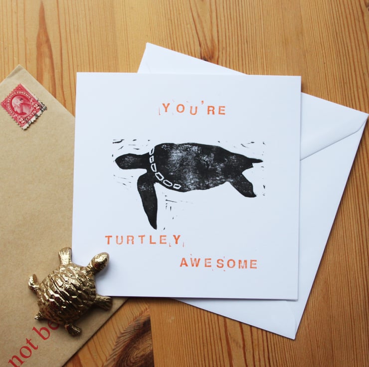A card that's perfect for any occasion, to tell someone how turtley awesome they are! Text available in Orange or Pink.