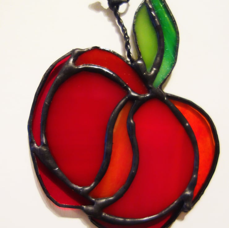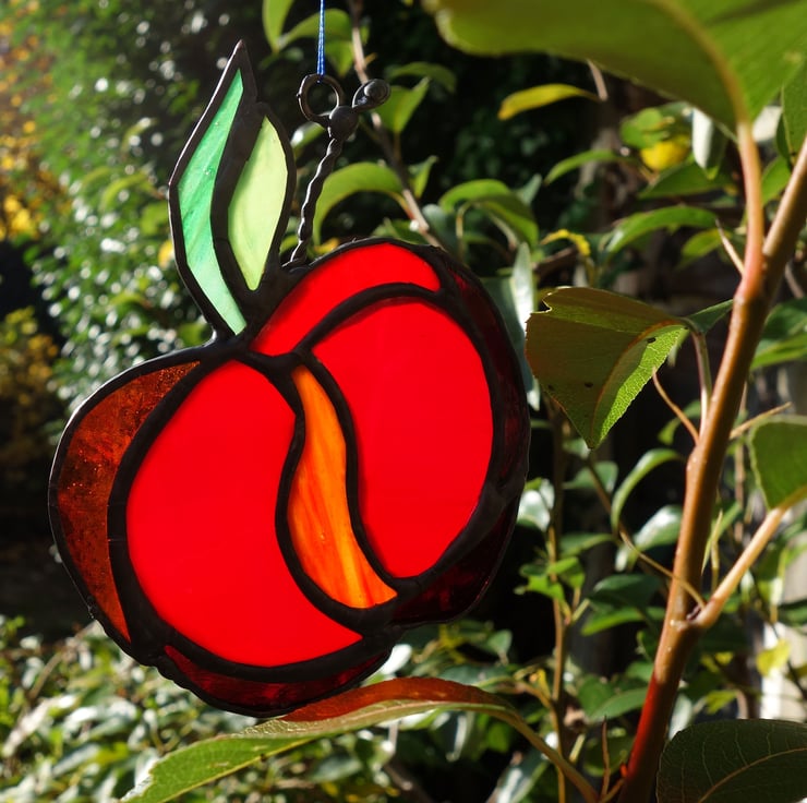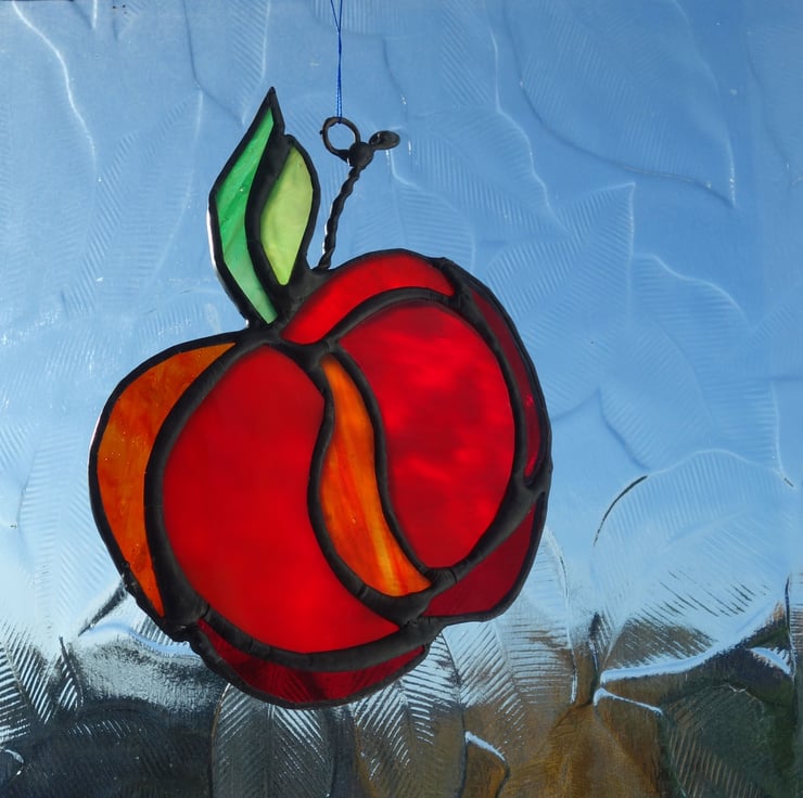 An apple a day? Apples are so quintessentially British for me. I love seeing green trees dotted with plump red apples. I also go foraging in the autumn, and make my own jams and chutneys using apples and other woodland fruits. It made sense to recreate one of my favourite fruits in the beauty of stained glass.