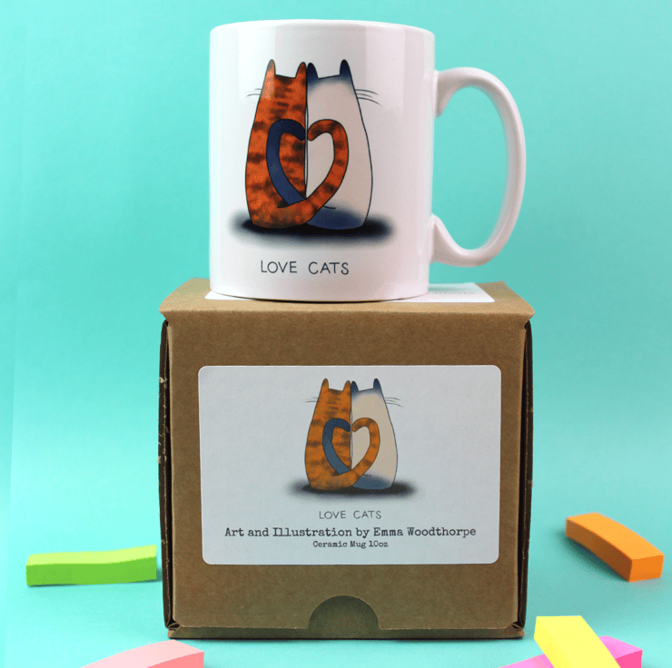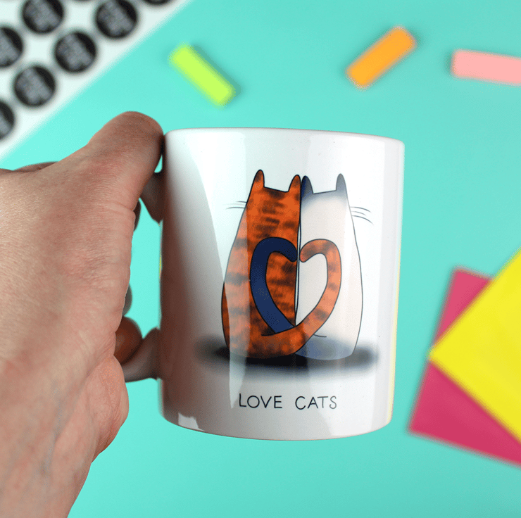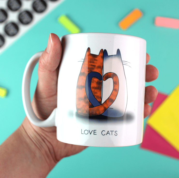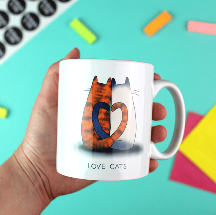 This 10oz Ceramic mug features two cats, tails entwined to make a heart. Underneath are the words Love Cats. Anyoe who is a fan of The Cure will surely smile when they see this image. Indeed anyone one who loves cats would love this mug!