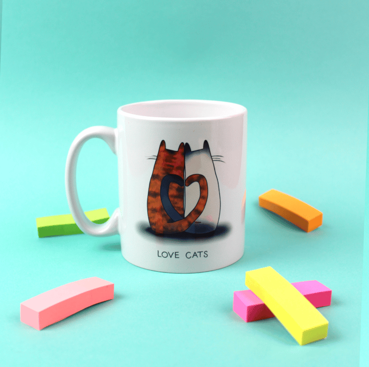 The mug's background colour is white, and the cat illustration is featured on both sides.