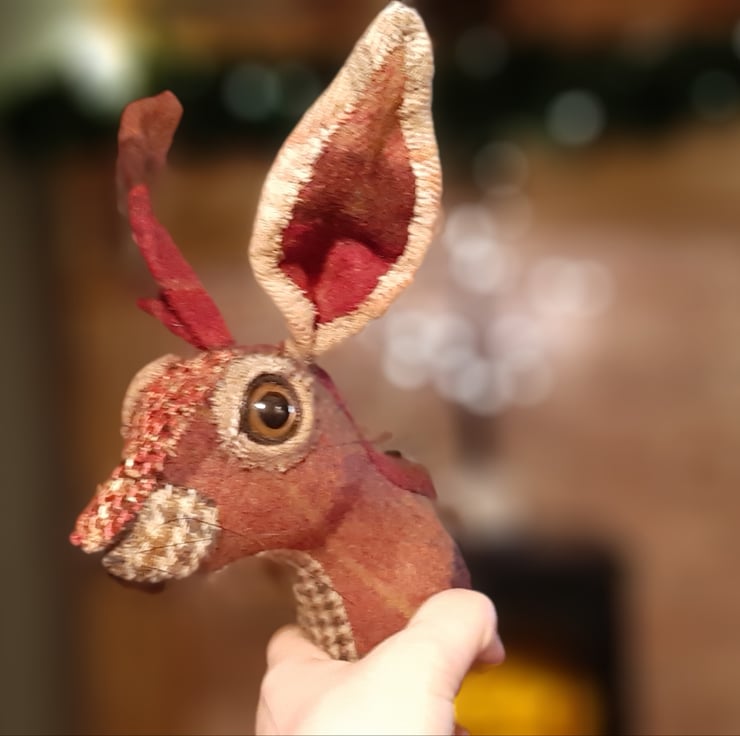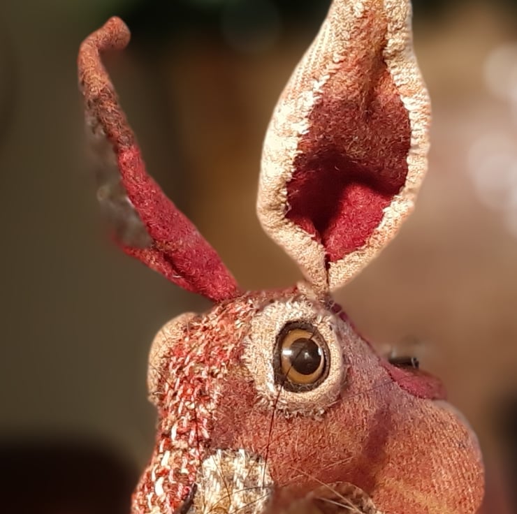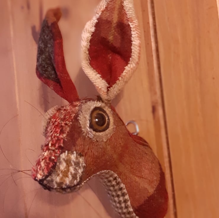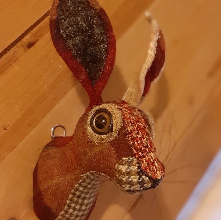 A lifesize (but not real) hare head which I have cast myself and covered in tweed and tartan fabric. It is a hand stitched item. It is backed with felt and has a metal hanger to hang it on the wall.