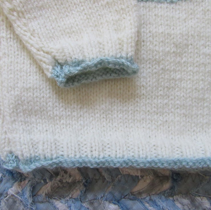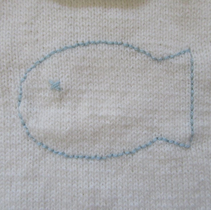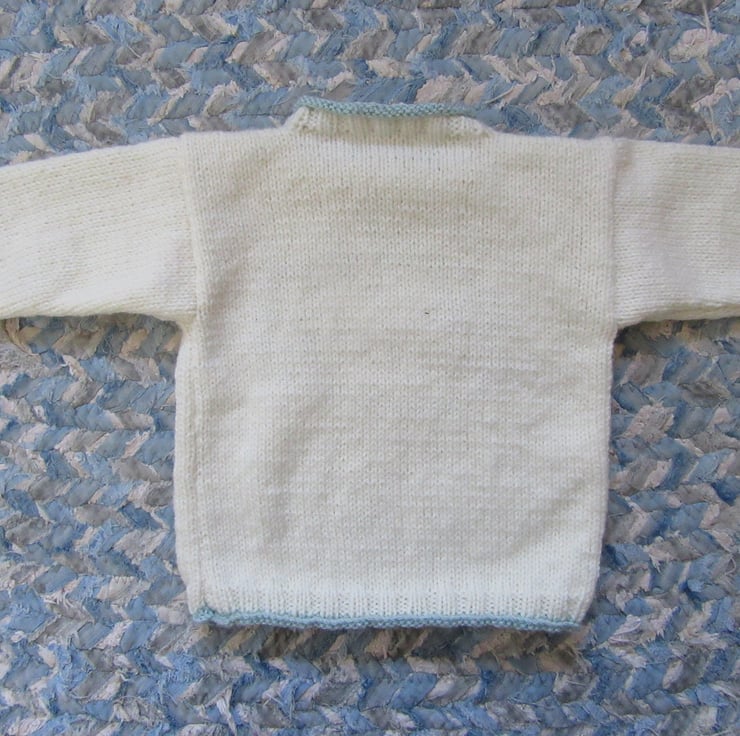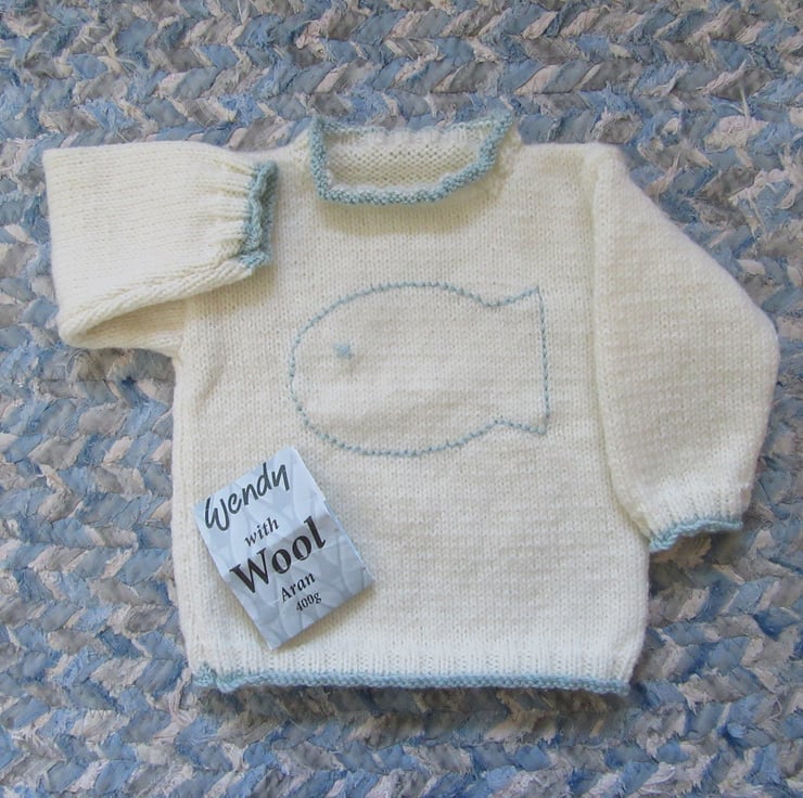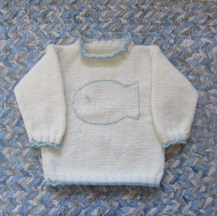 A beautifully hand knitted cream children's jumper. The hem, cuffs and neck are knitted in rib with a pale blue roll over edge, lending a relaxed look to the jumper. The front has an oversized big cartoon fish hand embroidered in pale blue coloured yarn. It is knitted in an 80% acrylic / 20% wool yarn. Machine washable on a gentle 30 wash.