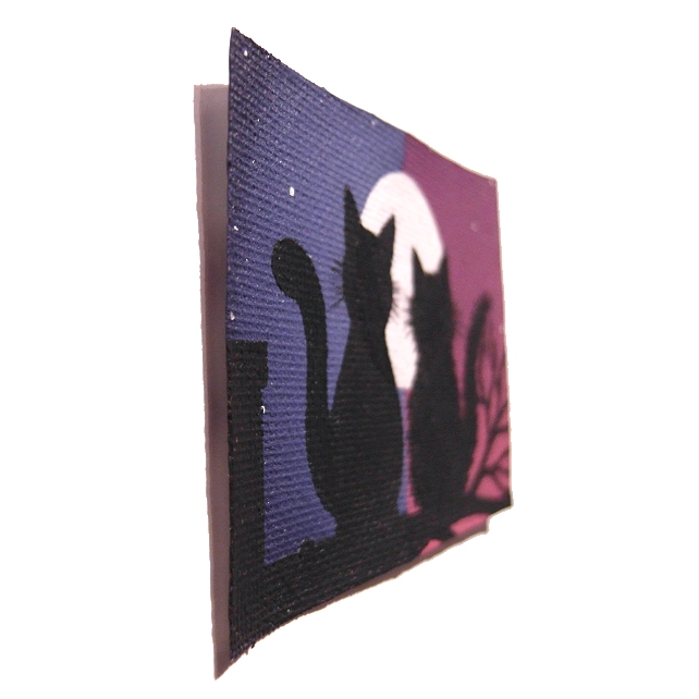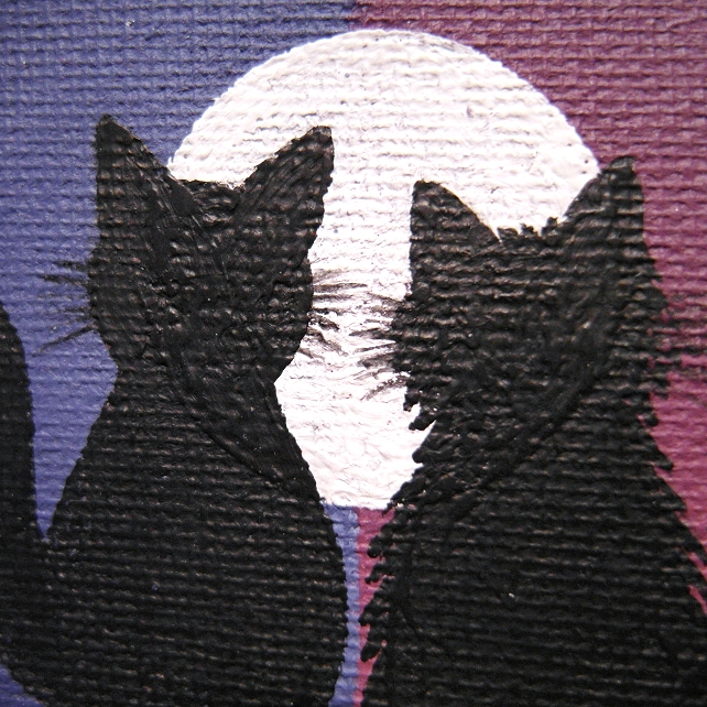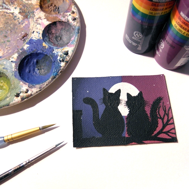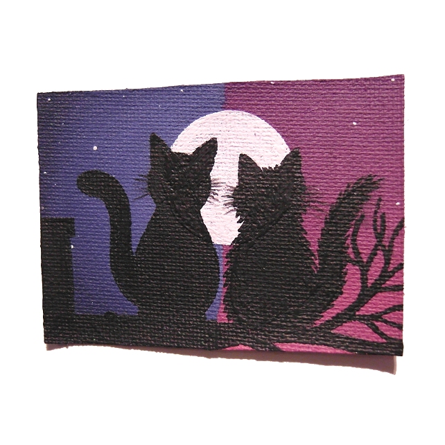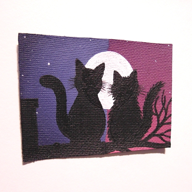 An original ACEO with the silhouette of 2 cats both looking up at the moon. The canvas is split in two, showing different time zones, brought together by the visible moon in both. On the first half is a large shorthair cat, sat on a roof looking into a dark blue night sky, and on the second half is a longhair cat, sat in a tree looking up at a purple and pink dusk sky. Although apart, these loved up cats can feel a closeness as they both gaze up at the same night sky.