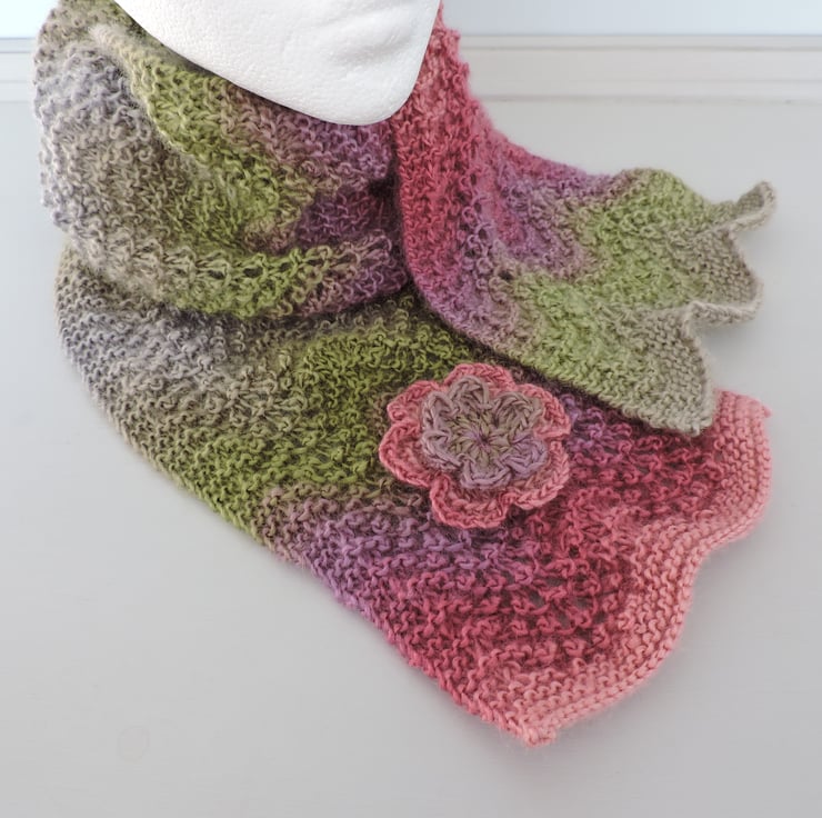 This pretty scarf has been knitted in a soft graduated colour 100% acrylic yarn. A pretty lacy and wavy pattern with scalloped ends. Gorgeous colours of pink, soft lilac, pale grey and green. Finished with a double layer crochet flower. Beautifully soft and warm.