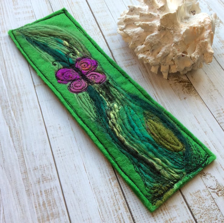 This butterfly needle felting bookmark is enhanced with free motion embroidery. The butterfly is set against a nature inspired background on green felt. The bookmark measures 5.5 x 17.5cm.