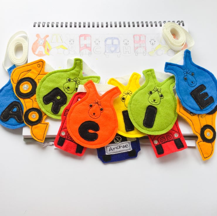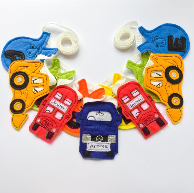 This little banner of personalised bunting has been made using freemotion and hand embroidery. Bright yellow diggers and lovely red London buses have been used for inspiration for the chosen motifs.