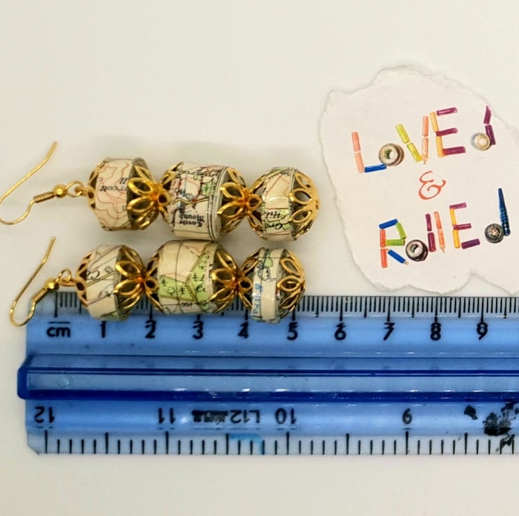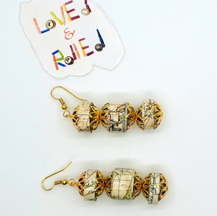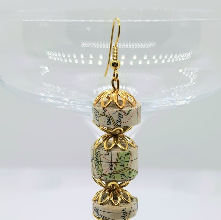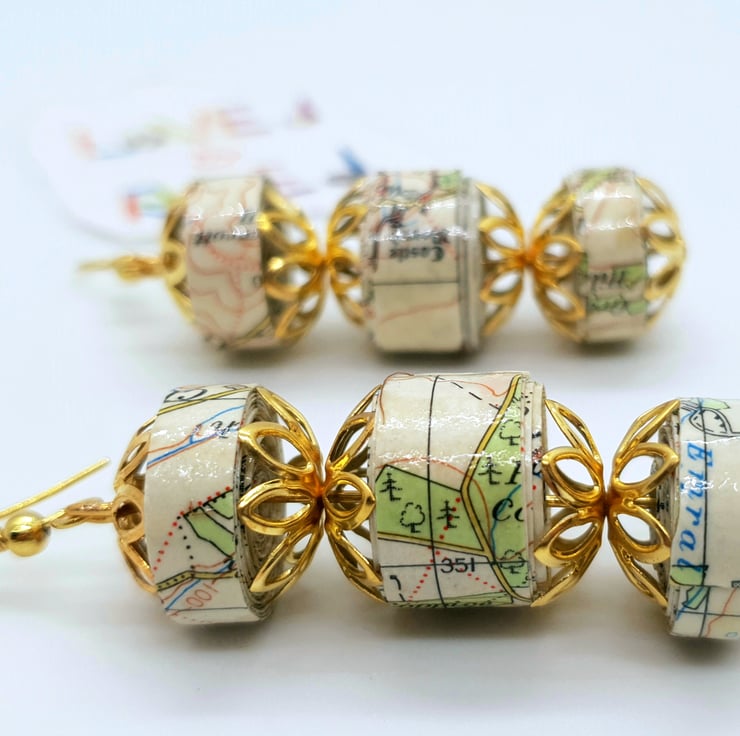 This pair of dangling earrings made of paper beads is just a bit of fun for Christmas. Although the beads are made of an old OS map, the design is inspired by the shape of a Christmas cracker. The beads are made of strips of map paper which are hand rolled and then varnished. These circles of paper beads of different sizes are topped and tailed by golden findings and mounted on gold plated earring hooks