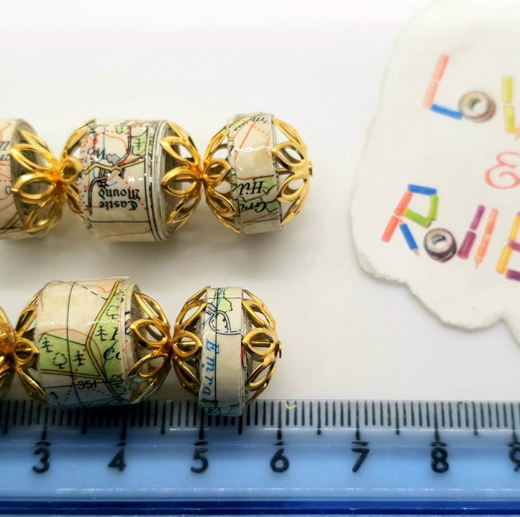 Please note that, as I work with recycled paper, and with whatever design is on a page, the beads are not identical.
