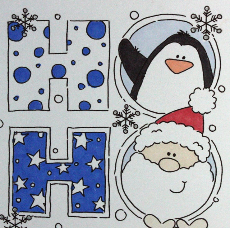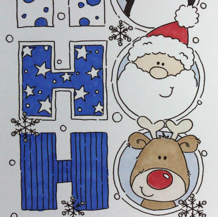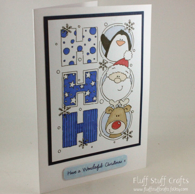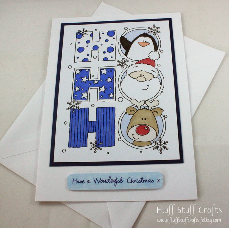 Handmade Christmas card featuring a hand coloured image of the phrase 'Ho Ho Ho', with a penguin, Santa and a reindeer popping out of the 'Os'. The image is layered onto dark blue card and the sentiment reads: 'Have a Wonderful Christmas x'.