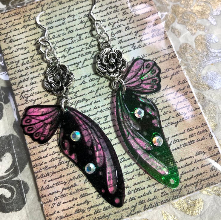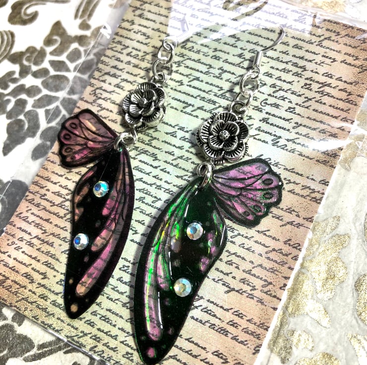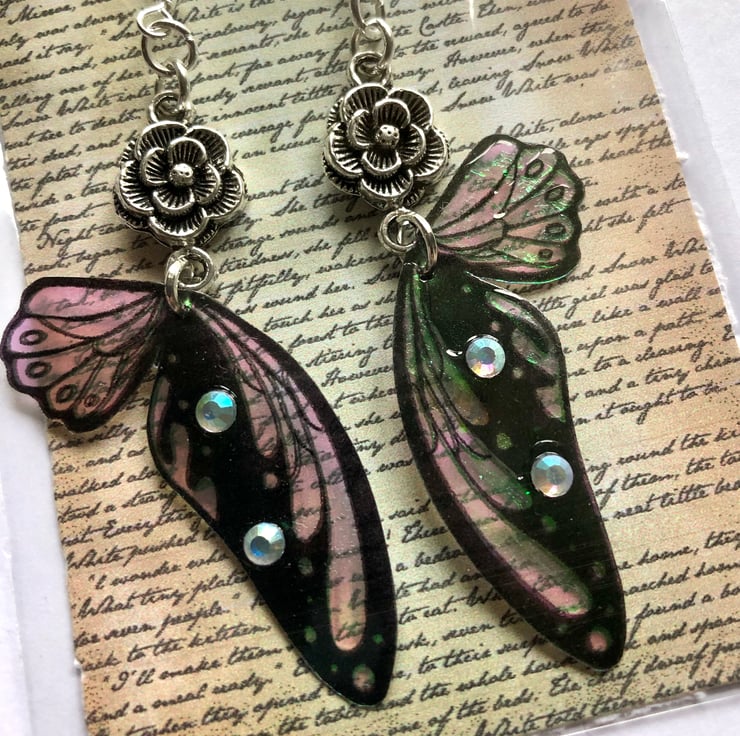 The sparkling fairy wings hang daintily beneath silver coloured rose connectors.